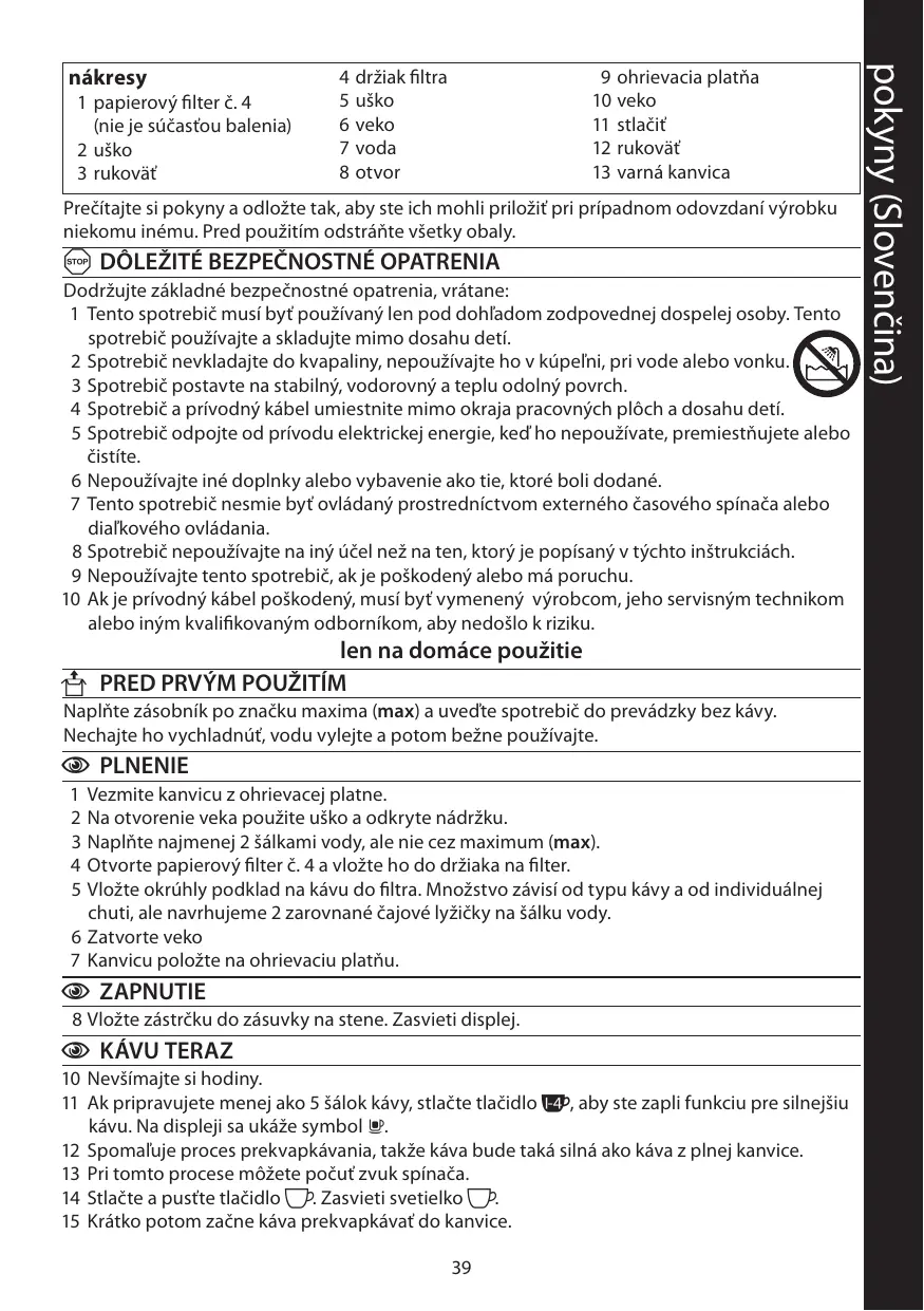 len na domáce použitie U PRED PRVÝM POUŽITÍM Naplňte zásobník po značku maxima (max) a uveďte spotrebič do prevádzky bez kávy. Nechajte ho vychladnúť, vodu vylejte a potom bežne používajte.