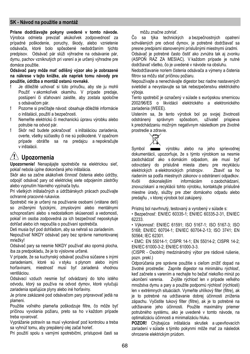SK - Návod na použitie a montáž môžu značne zohriať. Čo sa týka technických a bezpečnostných opatrení schválených pre odvod dymov, je potrebné dodržiavať sa presne predpismi stanovenými príslušnými miestnymi úradmi. Odsávač je potrebné často čistiť ako zvnútra tak aj zvonku (ASPOŇ RAZ ZA MESIAC). V každom prípade je nutné dodržiavať všetko, čo je uvedené v návode na obsluhu. Nedodržiavanie noriem čistenia odsávača a výmeny a čistenia filtrov sa môžu stať príčinou požiaru. Nepoužívajte a nenechávajte digestor bez riadne nastavených svietidiel a nevystavujte sa tak nebezpečenstvu elektrického výboja. Tento spotrebič je označený v súlade s európskou smernicou 2002/96/ES o likvidácii elektrického a elektronického zariadenia (WEEE). Uistením sa, že tento výrobok bol po svojej životnosti odstránený správnym spôsobom, užívateľ prispieva k predchádzaniu možným negatívnym následkom pre životné prostredie a zdravie. Prísne dodržiavajte pokyny uvedené v tomto návode. Výrobca odmieta prevziať akúkoľvek zodpovednosť za prípadné poškodenie, poruchy, škody, alebo vznietenie odsávača, ktoré bolo spôsobené nedodržaním týchto predpisov. Odsávač pár slúži výhradne na odsávanie pár, dymu, pachov vzniknutých pri varení a je určený výhradne pre domáce použitie. Odsávač pary môže mať odlišný výzor ako je zobrazené na nákrese v tejto knižke, ale napriek tomu návody pre použitie, údržba a montáž ostanú rovnaké. Je dôležité uchovať si túto príručku, aby ste ju mohli Použiť v akomkoľvek okamihu. V prípade predaje, postúpení či sťahovaní zaistite, aby zostala spoločne s odsávačom pár. Pozorne si prečítajte návod: obsahuje dôležité informácie o inštalácii, použití a bezpečnosti. Nemeňte elektrickú či mechanickú úpravu výrobku alebo potrubie na odvod pár. Skôr než budete pokračovať s inštaláciou zariadenia, overte, všetky súčiastky či nie sú poškodené. V opačnom prípade obráťte sa na predajcu a nepokračujte v inštalácii. Symbol výrobku alebo na jeho sprievodnej dokumentácii, upozorňuje, že s týmto výrobkom sa nesmie zaobchádzať ako s domácim odpadom, ale musí byť odovzdaný do príslušné miesta zberu pre recykláciu elektrických a elektronických prístrojov. Zbaviť sa ho riadením sa podľa miestnych zákonov o odstránení odpadkov. Kvôli dokonalejším informáciám o zaobchádzaní, znovuzískaní a recyklácii tohto výrobku, kontaktujte príslušné miestne úrady, služby pre zber domáceho odpadu alebo predajňu , v ktorej výrobok bol zakúpený. Upozornenia Upozornenie! Nenapájajte spotrebiče na elektrickou sieť, pokiaľ nebola úplne dokončená jeho inštalácia. Skôr ako sa začne akákoľvek činnosť čistenia alebo údržby, odpojiť odsávač pary od elektrickej siete odpojením zástrčky alebo vypnutím hlavného vypínača bytu. Pri všetkých inštalačných a údržbárskych prácach používajte ochranné pracovné rukavice. Spotrebič nie je určený na používanie osobami (vrátane detí) so zníženými fyzickými, zmyslovými alebo mentálnymi schopnosťami alebo s nedostatkom skúseností a vedomostí, pokiaľ im osoba zodpovedná za ich bezpečnosť neposkytuje dohľad alebo ich nepoučila o používaní spotrebiča. Deti musia byť pod dohľadom, aby sa nehrali so zariadením. Nepoužívať NIKDY odsávač pary bez správne namontovanej mriežky! Odsávač pary sa nesmie NIKDY používať ako oporná plocha, iba za predpokladu, že je to výslovne určené. V prípade, že sa kuchynský odsávač používa súčasne s inými zariadeniami, ktoré sú v styku s plynom alebo inými horľavinami, miestnosť musí byť zariadená vhodnou ventiláciou. Odsávací vzduch nesmie byť odvádzaný do toho istého odvodu, ktorý sa používa na odvod dymov, ktoré vylučujú zariadenia spaľujúce plyny alebo iné horľaviny. Je prísne zakázané pod odsávačom pary pripravovať jedlá na plameni. Použitie voľného plameňa poškodzuje filtre, čo môže byť príčinou vyvolania požiaru, preto sa ho v každom prípade treba vyvarovať. Vyprážanie potravín sa musí vykonávať pod kontrolou a treba sa vyhnúť tomu, aby prepálený olej začal horieť. Pri použití spolu s varnými spotrebičmi, prístupové časti sa Prístroj bol navrhnutý, testovaný a vyrobený v súlade s: