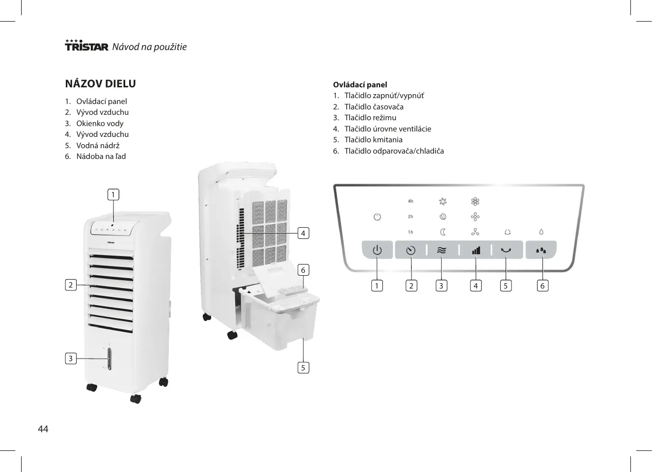 Vyberte zariadenie a príslušenstvo z krabice. Zo zariadenia odstráňte nálepky, ochrannú fóliu alebo plast. Nainštalujte univerzálne kolieska: Vyberte univerzálne koliesko a nainštalujte ho na chladič vzduchu. Z telesa vyberte vodnú nádrž asi na 1/3 a nalejte do nej vodu. Zabezpečte, aby bolo napájanie vypnuté minimálne na 2 minúty. Počas nalievania dajte pozor na čiarku vody. Zabezpečte, aby hladina vody nebola vyššia ako čiarka vody “MAX” a nižšia ako čiarka vody “MIN”. Pre zvýšenie chladiaceho efektu môžete do vodnej nádrže vložiť zamrznutú nádobu na ľad. Pozor: Napájací kábel nepripájajte s mokrými rukami. PREVÁDZKA Funkcia ovládacieho panelu Tlačidlo Funkcia Tlačidlo zapnutia/ Jednotku zapojte do elektrickej zásuvky. Stlačte tlačidlo vypnutia Zapnúť/Vypnúť pre spustenie chodu. Tlačidlo časovača Keď chladič vzduchu beží, stlačte tlačidlo Časovača pre prednastavenie času chodu, každé stlačenie zvýši prednastavený čas o jednu hodinu. Tlačidlo režimu Stlačte tlačidlo Režim pre voľbu medzi rôznymi režimami toku vzduchu normálny, prirodzený, spánkový. Tlačidlo úrovne Sú tu 3 rôzne úrovne rýchlosti: Nízka /Stredná /Vysoká, vetrania stlačte toto tlačidlo a nastavte želanú rýchlosť. s nádobou na ľad, táto jednotka môže znížiť teplotu okolia asi ot 3°C. Nádoba na ľad