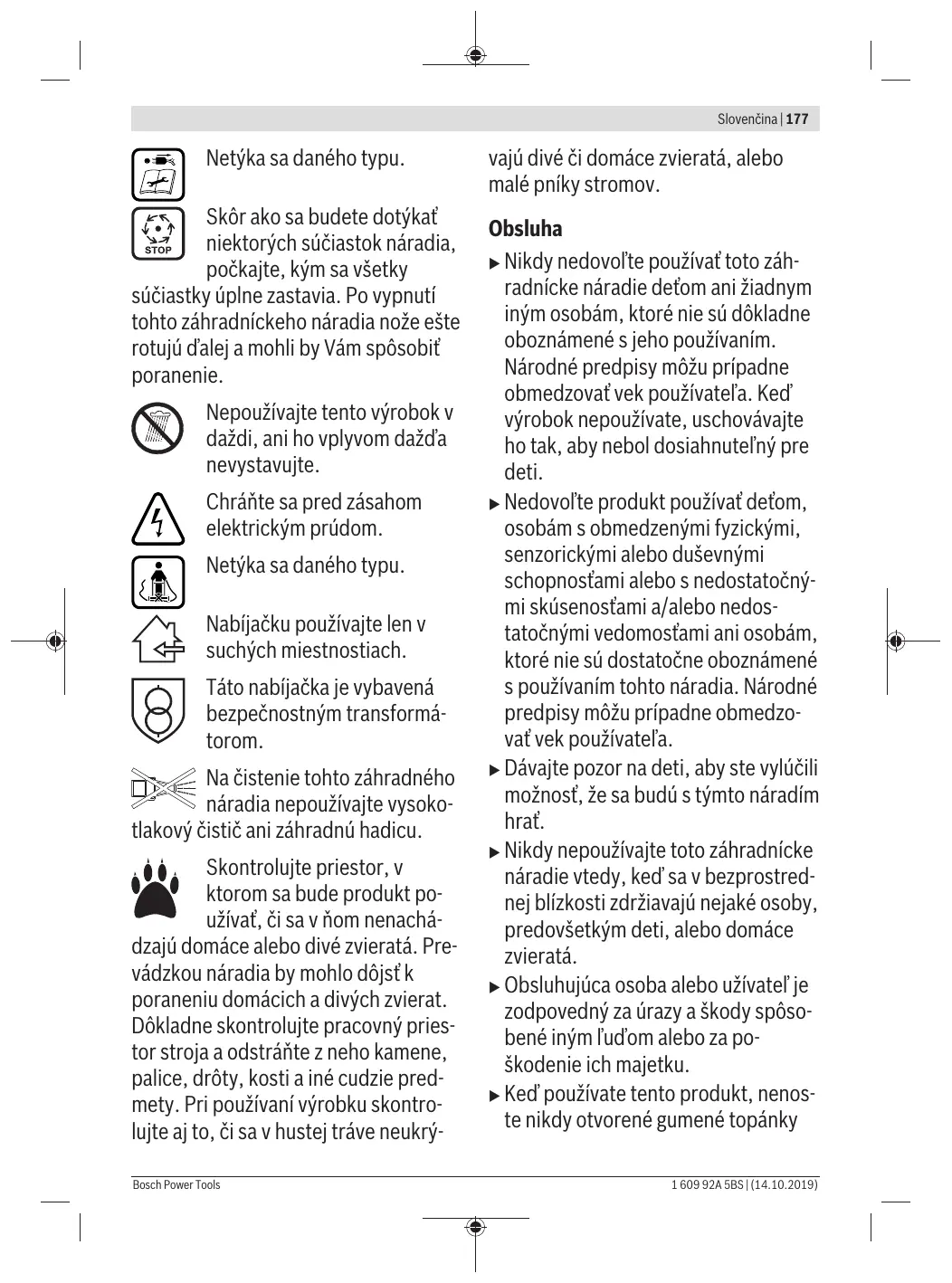 Odstranění – Akumulátor uskladněte odděleně a nikoli v nabíječce. – Při přímém slunečním záření nenechávejte akumulátor v zahradním nářadí. – Optimální teplota pro uskladnění akumulátoru činí 5 °C. – Příležitostně vyčistěte větrací otvory akumulátoru měkkým, čistým a suchým štětcem. Výrazně zkrácená doba provozu po nabití ukazuje, že je akumulátor opotřebovaný a musí se nahradit. Zákaznická služba a poradenství ohledně použití www.bosch-garden.com 1 609 92A 5BS | (14.10.2019) 176 | Slovenčina U všech dotazů a objednávek náhradních dílů nezbytně prosím uvádějte 10-místné objednací číslo podle typového štítku výrobku. Czech Republic Robert Bosch odbytová s.r.o. Bosch Service Center PT K Vápence 1621/16 692 01 Mikulov Na www.bosch-pt.cz si si můžete objednat opravu Vašeho stroje nebo náhradní díly online. Tel.: +420 519 305700 Fax: +420 519 305705 E-Mail: servis.naradi@cz.bosch.com www.bosch-pt.cz Přeprava Obsažené lithium-iontové akumulátory podléhají požadavkům zákona o nebezpečných nákladech. Tyto akumulátory mohou být bez dalších podmínek přepravovány uživatelem po silnici. Při zasílání prostřednictvím třetí osoby (např.: letecká přeprava nebo spedice) je třeba brát zřetel na zvláštní požadavky na balení a označení. Zde musí být při přípravě zásilky nezbytně přizván expert na nebezpečné náklady. Akumulátory zasílejte pouze tehdy, pokud je těleso nepoškozené. Otevřené kontakty přelepte lepicí páskou a akumulátor zabalte tak, aby se v obalu nemohl pohybovat. Dodržujte prosím také případné další národní předpisy. Zpracování odpadů Zahradní nářadí, akumulátory, příslušenství a obaly mají být dodány k opětovnému zhodnocení nepoškozujícímu životní prostředí. Nevyhazujte zahradní nářadí a akumulátory/ baterie do domovního odpadu! Pouze pro země EU: Podle evropské směrnice 2012/19/EU musejí být neupotřebitelná elektrická a elektronická zařízení a podle evropské směrnice 2006/66/ES vadné nebo opotřebované akumulátory/baterie odděleně shromážděny a dodány k opětovnému zhodnocení nepoškozujícímu životní prostředí. Akumulátory/baterie: Li-ion: Dbejte prosím upozornění v odstavci Přeprava. 1 609 92A 5BS | (14.10.2019) Slovenčina Bezpečnostné pokyny Pozor! Starostlivo si prečítajte pokyny uvedené v nasledujúcom texte. Dôkladne sa oboznámte s obslužnými prvkami a so správnym používaním tohto výrobku. Návod na používanie si láskavo starostlivo uschovajte na neskoršie používanie. Vysvetlenie symbolov na náradí Všeobecné upozornenie na nebezpečenstvo Prečítajte si Návod na používanie. Dávajte pozor na to, aby sa osoby stojace v blízkosti neporanili odletujúcimi cudzími telieskami. Upozornenie: Keď sa s výrobkom pracuje, zachovávajte od neho bezpečný odstup. Zachovajte opatrnosť: Nedotýkajte sa rotujúcich nožov. Tieto nože sú ostré. Chráňte sa pred stratou prstov na nohách alebo na rukách. Záhradnícke náradie vypnite a uvoľnite odpojovač elektrického obvodu pred každou údržbou alebo pred každým čistením, alebo vždy vtedy, keď záhradnícke náradie nechávate hoci len na krátku chvíľu bez dozoru. Bosch Power Tools Slovenčina | 177 Netýka sa daného typu. Skôr ako sa budete dotýkať niektorých súčiastok náradia, počkajte, kým sa všetky súčiastky úplne zastavia. Po vypnutí tohto záhradníckeho náradia nože ešte rotujú ďalej a mohli by Vám spôsobiť poranenie. Nepoužívajte tento výrobok v daždi, ani ho vplyvom dažďa nevystavujte. Chráňte sa pred zásahom elektrickým prúdom. Netýka sa daného typu. Nabíjačku používajte len v suchých miestnostiach. Táto nabíjačka je vybavená bezpečnostným transformátorom. Na čistenie tohto záhradného náradia nepoužívajte vysokotlakový čistič ani záhradnú hadicu. Skontrolujte priestor, v ktorom sa bude produkt používať, či sa v ňom nenachádzajú domáce alebo divé zvieratá. Prevádzkou náradia by mohlo dôjsť k poraneniu domácich a divých zvierat. Dôkladne skontrolujte pracovný priestor stroja a odstráňte z neho kamene, palice, drôty, kosti a iné cudzie predmety. Pri používaní výrobku skontrolujte aj to, či sa v hustej tráve neukrýBosch Power Tools vajú divé či domáce zvieratá, alebo malé pníky stromov. Obsluha u Nikdy nedovoľte používať toto záhradnícke náradie deťom ani žiadnym iným osobám, ktoré nie sú dôkladne oboznámené s jeho používaním. Národné predpisy môžu prípadne obmedzovať vek používateľa. Keď výrobok nepoužívate, uschovávajte ho tak, aby nebol dosiahnuteľný pre deti. u Nedovoľte produkt používať deťom, osobám s obmedzenými fyzickými, senzorickými alebo duševnými schopnosťami alebo s nedostatočnými skúsenosťami a/alebo nedostatočnými vedomosťami ani osobám, ktoré nie sú dostatočne oboznámené s používaním tohto náradia. Národné predpisy môžu prípadne obmedzovať vek používateľa. u Dávajte pozor na deti, aby ste vylúčili možnosť, že sa budú s týmto náradím hrať. u Nikdy nepoužívajte toto záhradnícke náradie vtedy, keď sa v bezprostrednej blízkosti zdržiavajú nejaké osoby, predovšetkým deti, alebo domáce zvieratá. u Obsluhujúca osoba alebo užívateľ je zodpovedný za úrazy a škody spôsobené iným ľuďom alebo za poškodenie ich majetku. u Keď používate tento produkt, nenoste nikdy otvorené gumené topánky 1 609 92A 5BS | (14.10.2019) 178 | Slovenčina ani sandále. Pri práci noste vždy pevnú obuv a dlhé nohavice. u Dôkladne preskúmajte plochu, ktorú budete kultivovať a odstráňte kamene, palice, drôty, kosti a iné cudzie telesá. u Pred použitím vždy zrakom skontrolujte, či nie sú nôž, skrutky noža a konštrukčná rezacia skupina opotrebovan