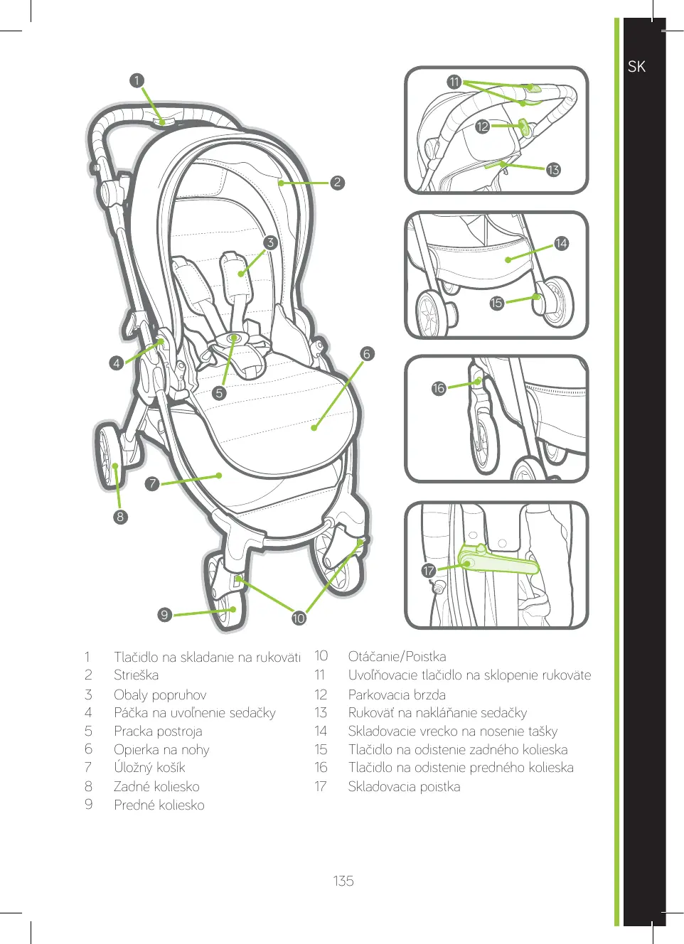 Tlačidlo na skladanie na rukoväti Strieška Obaly popruhov Páčka na uvoľnenie sedačky Pracka postroja Opierka na nohy Úložný košík Zadné koliesko Predné koliesko