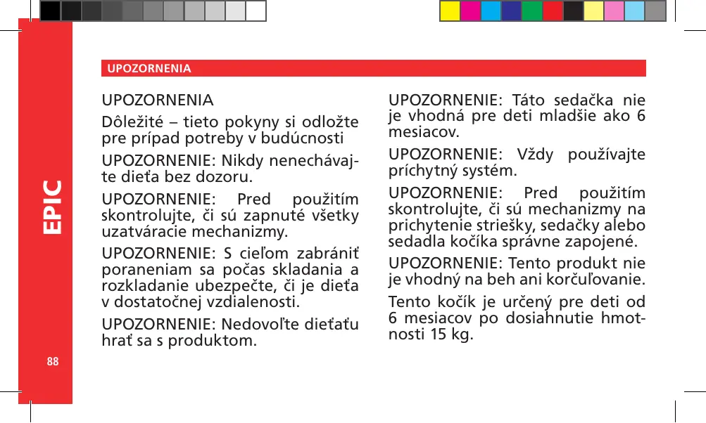 à des enfants de moins de 6 mois. AVERTISSEMENT Toujours utiliser le système de retenue. AVERTISSEMENT Vérifier que les dispositifs de fixation de la nacelle, du siège ou du siège-auto sont correctement enclenchés avant utilisation. AVERTISSEMENT Ce produit ne convient pas pour faire du jogging ou des promenades en rollers. Ce véhicule est conçu pour des enfants âgés de 6 mois à 15 kg.