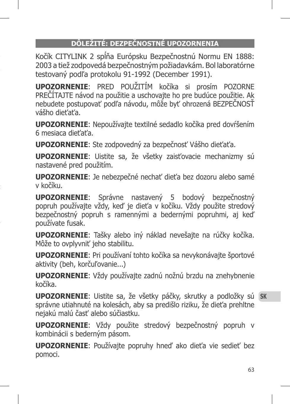 AVERTISSEMENT: Vous êtes responsable de la sécurité de votre enfant. FR AVERTISSEMENT: S’assurer que tous les dispositifs de verrouillage sont correctement enclenchés avant utilisation. AVERTISSEMENT: Il peut être dangereux de laisser votre enfant sans surveillance. AVERTISSEMENT: En toutes circonstances, attachez l’enfant avec le harnais de sécurité à 5 points ajusté à sa taille lorsque vous utilisez la poussette. Toujours utiliser la sangle de l’entrejambe avec le harnais de sécurité, même si vous utilisez une chancelière. AVERTISSEMENT: Le fait d’accrocher au poussoir une charge influe sur la stabilité de la poussette / du landau. AVERTISSEMENT: Ne pas utiliser ce produit en faisant du jogging ou des promenades en rollers. AVERTISSEMENT: Utilisez toujours le frein arrière au pied pour immobiliser la poussette. AVERTISSEMENT: Vous devez veiller à ce que les molettes et les bouchons des valves soient fermement vissés sur les roues pour éviter tout risque dû à la présence de petits éléments susceptibles d’être ingérés. AVERTISSEMENT: Ne jamais utiliser l’entrejambe sans la ceinture de maintien. AVERTISSEMENT: Utilisez un harnais dès que l’enfant peut tenir assis tout seul. 27