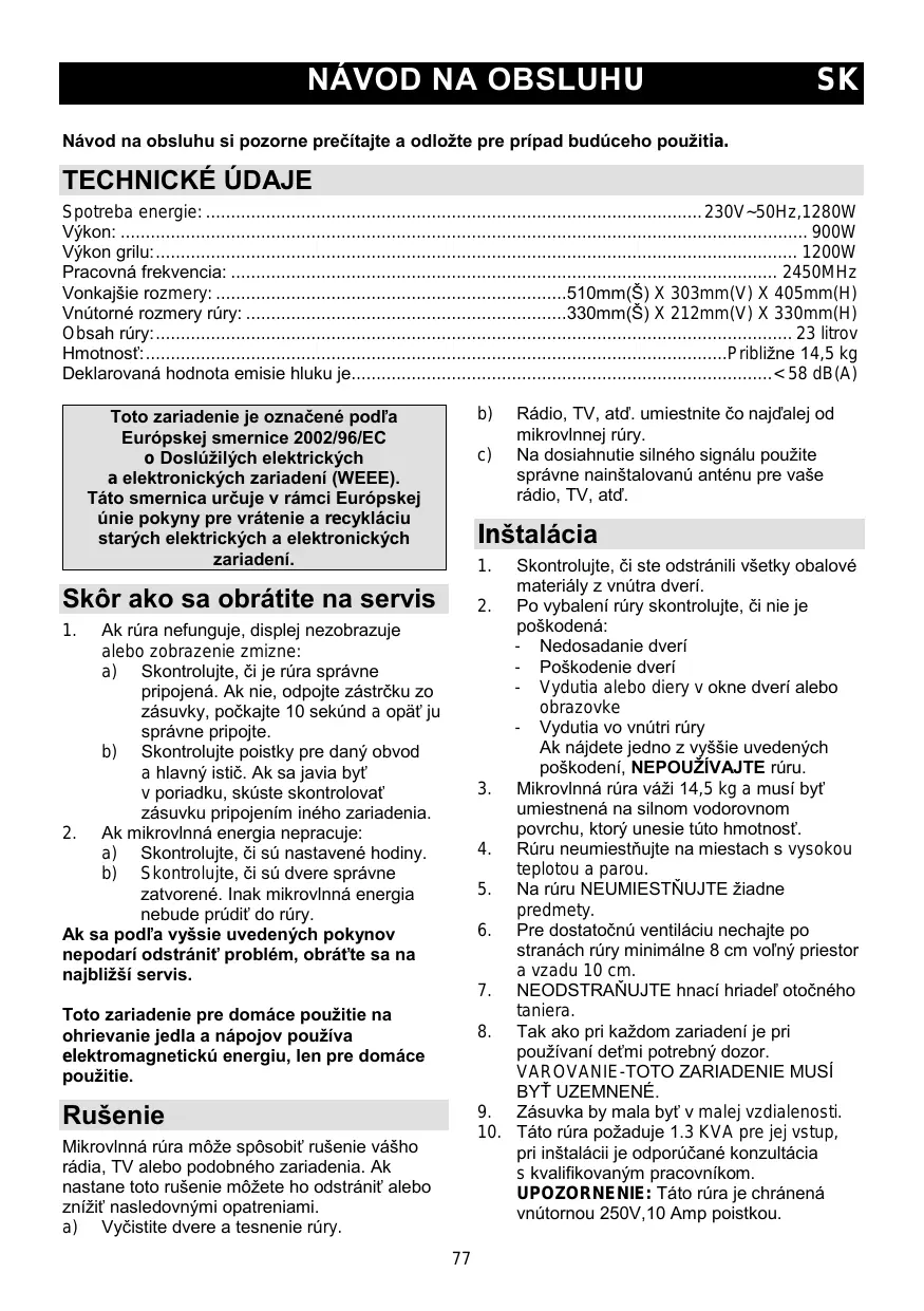 VAROVANIE: Pri pouņìvanì zariadenia v kombinovanom reņime, by mali deti pouņìvať rúru len pod dohľadom dospelých kvôli generovaným teplotám; (Len pre modely s funkciou grilovania) VAROVANIE: Ak sú dvere alebo tesnenie dverì pońkodené, rúru nesmiete pouņìvať, pokiaľ nebude opravená kompetentnou osobou; VAROVANIE: Pre kaņdého, okrem kompetentnej osoby, je nebezpeĉné vykonávať opravy a údrņbu, ktorá zahŕňa demontáņ krytu, ktorý chráni pred mikrovlnnou energiou.; VAROVANIE: Tekutiny a iné potraviny nesmú byť ohrievané v uzatvorených nádobách, pretoņe môņu explodovať.