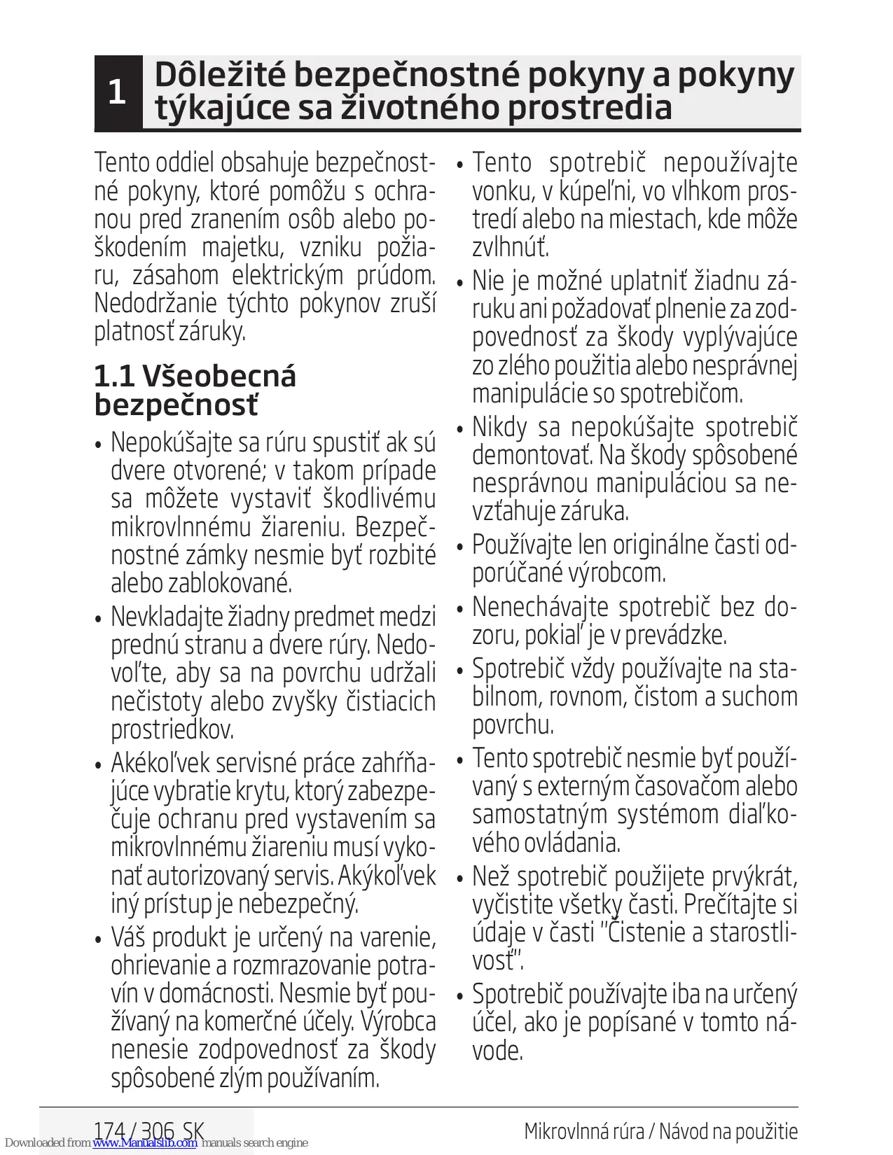 - • Skontrolujte, či vaša napájanie zrušeniu platnosti záruky. zodpovedá informáciám uvede•• Mikrovlnná rúra nesmie byť ným na štítku spotrebiča. umiestnená do skrine, ktorá nezodpovedá pokynom na inštaláciu. Jediný spôsob, ako odpojiť zariadenie od zdroja napájania, je odpojiť napájací adaptér. Mikrovlnná rúra / Návod na použitie Downloaded from www.Manualslib.com manuals search engine 175 / 306 SK Dôležité bezpečnostné pokyny a pokyny 1 týkajúce sa životného prostredia