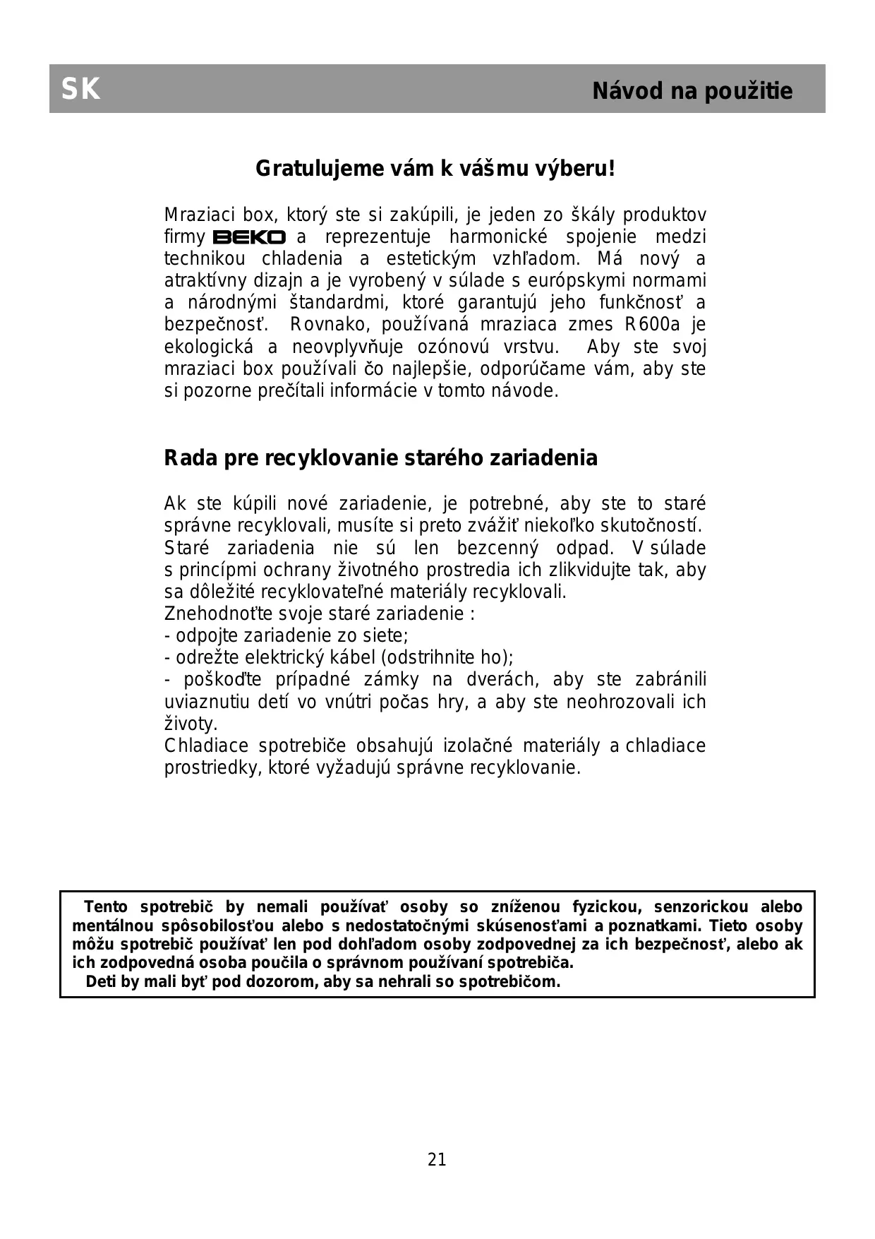 Návod na použitie Gratulujeme vám k vášmu výberu! Mraziaci box, ktorý ste si zakúpili, je jeden zo škály produktov firmy BEKO a reprezentuje harmonické spojenie medzi technikou chladenia a estetickým vzhľadom. Má nový a atraktívny dizajn a je vyrobený v súlade s európskymi normami a národnými štandardmi, ktoré garantujú jeho funkčnosť a bezpečnosť. Rovnako, používaná mraziaca zmes R600a je ekologická a neovplyvňuje ozónovú vrstvu. Aby ste svoj mraziaci box používali čo najlepšie, odporúčame vám, aby ste si pozorne prečítali informácie v tomto návode. Rada pre recyklovanie starého zariadenia Ak ste kúpili nové zariadenie, je potrebné, aby ste to staré správne recyklovali, musíte si preto zvážiť niekoľko skutočností. Staré zariadenia nie sú len bezcenný odpad. V súlade s princípmi ochrany životného prostredia ich zlikvidujte tak, aby sa dôležité recyklovateľné materiály recyklovali. Znehodnoťte svoje staré zariadenie : - odpojte zariadenie zo siete; - odrežte elektrický kábel (odstrihnite ho); - poškoďte prípadné zámky na dverách, aby ste zabránili uviaznutiu detí vo vnútri počas hry, a aby ste neohrozovali ich životy. Chladiace spotrebiče obsahujú izolačné materiály a chladiace prostriedky, ktoré vyžadujú správne recyklovanie. Tento spotrebič by nemali používať osoby so zníženou fyzickou, senzorickou alebo mentálnou spôsobilosťou alebo s nedostatočnými skúsenosťami a poznatkami. Tieto osoby môžu spotrebič používať len pod dohľadom osoby zodpovednej za ich bezpečnosť, alebo ak ich zodpovedná osoba poučila o správnom používaní spotrebiča. Deti by mali byť pod dozorom, aby sa nehrali so spotrebičom.