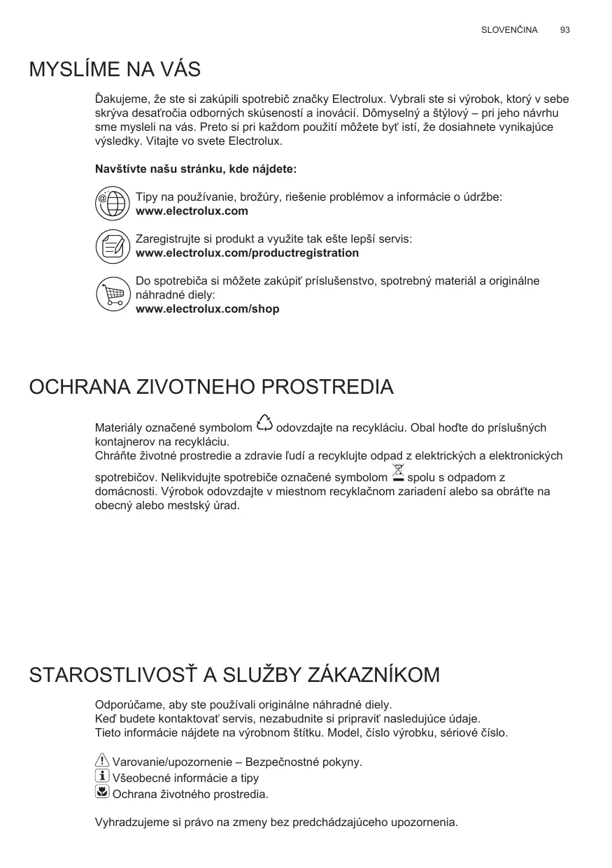 Ďakujeme, že ste si zakúpili spotrebič značky Electrolux. Vybrali ste si výrobok, ktorý v sebe skrýva desaťročia odborných skúseností a inovácií. Dômyselný a štýlový – pri jeho návrhu sme mysleli na vás. Preto si pri každom použití môžete byť istí, že dosiahnete vynikajúce výsledky. Vitajte vo svete Electrolux. Navštívte našu stránku, kde nájdete: Tipy na používanie, brožúry, riešenie problémov a informácie o údržbe: www.electrolux.com Zaregistrujte si produkt a využite tak ešte lepší servis: www.electrolux.com/productregistration Do spotrebiča si môžete zakúpiť príslušenstvo, spotrebný materiál a originálne náhradné diely: www.electrolux.com/shop