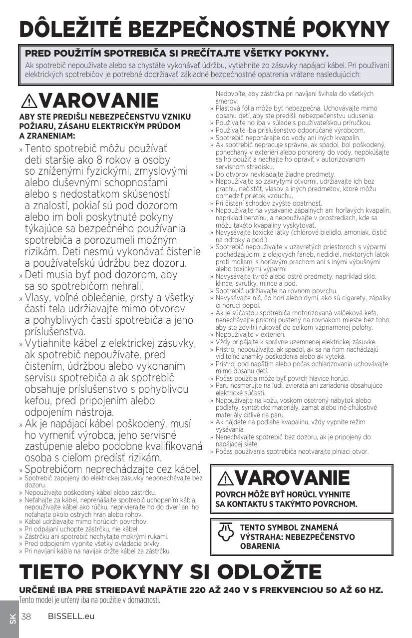 PRED POUŽITÍM SPOTREBIČA SI PREČÍTAJTE VŠETKY POKYNY. Ak spotrebič nepoužívate alebo sa chystáte vykonávať údržbu, vytiahnite zo zásuvky napájací kábel. Pri používaní elektrických spotrebičov je potrebné dodržiavať základné bezpečnostné opatrenia vrátane nasledujúcich: VAROVANIE ABY STE PREDIŠLI NEBEZPEČENSTVU VZNIKU POŽIARU, ZÁSAHU ELEKTRICKÝM PRÚDOM A ZRANENIAM: » Tento spotrebič môžu používať deti staršie ako 8 rokov a osoby so zníženými fyzickými, zmyslovými alebo duševnými schopnosťami alebo s nedostatkom skúseností a znalostí, pokiaľ sú pod dozorom alebo im boli poskytnuté pokyny týkajúce sa bezpečného používania spotrebiča a porozumeli možným rizikám. Deti nesmú vykonávať čistenie a používateľskú údržbu bez dozoru. » Deti musia byť pod dozorom, aby sa so spotrebičom nehrali. » Vlasy, voľné oblečenie, prsty a všetky časti tela udržiavajte mimo otvorov a pohyblivých častí spotrebiča a jeho príslušenstva. » Vytiahnite kábel z elektrickej zásuvky, ak spotrebič nepoužívate, pred čistením, údržbou alebo vykonaním servisu spotrebiča a ak spotrebič obsahuje príslušenstvo s pohyblivou kefou, pred pripojením alebo odpojením nástroja. » Ak je napájací kábel poškodený, musí ho vymeniť výrobca, jeho servisné zastúpenie alebo podobne kvalifikovaná osoba s cieľom predísť rizikám. » Spotrebičom neprechádzajte cez kábel. » Spotrebič zapojený do elektrickej zásuvky neponechávajte bez dozoru. » Nepoužívajte poškodený kábel alebo zástrčku. » Neťahajte za kábel, neprenášajte spotrebič uchopením kábla, nepoužívajte kábel ako rúčku, neprivierajte ho do dverí ani ho neťahajte okolo ostrých hrán alebo rohov. » Kábel udržiavajte mimo horúcich povrchov. » Pri odpájaní uchopte zástrčku, nie kábel. » Zástrčku ani spotrebič nechytajte mokrými rukami. » Pred odpojením vypnite všetky ovládacie prvky. » Pri navíjaní kábla na navijak držte kábel za zástrčku. Nedovoľte, aby zástrčka pri navíjaní švihala do všetkých smerov. » Plastová fólia môže byť nebezpečná. Uchovávajte mimo dosahu detí, aby ste predišli nebezpečenstvu udusenia. » Používajte ho iba v súlade s používateľskou príručkou. » Používajte iba príslušenstvo odporúčané výrobcom. » Spotrebič neponárajte do vody ani iných kvapalín. » Ak spotrebič nepracuje správne, ak spadol, bol poškodený, ponechaný v exteriéri alebo ponorený do vody, nepokúšajte sa ho použiť a nechajte ho opraviť v autorizovanom servisnom stredisku. » Do otvorov nevkladajte žiadne predmety. » Nepoužívajte so zakrytými otvormi, udržiavajte ich bez prachu, nečistôt, vlasov a iných predmetov, ktoré môžu obmedziť prietok vzduchu. » Pri čistení schodov zvýšte opatrnosť. » Nepoužívajte na vysávanie zápalných ani horľavých kvapalín, napríklad benzínu, a nepoužívajte v prostrediach, kde sa môžu takéto kvapaliny vyskytovať. » Nevysávajte toxické látky (chlórové bielidlo, amoniak, čistič na odtoky a pod.). » Spotrebič nepoužívajte v uzavretých priestoroch s výparmi pochádzajúcimi z olejových farieb, riedidiel, niektorých látok proti moliam, s horľavým prachom ani s inými výbušnými alebo toxickými výparmi. » Nevysávajte tvrdé alebo ostré predmety, napríklad sklo, klince, skrutky, mince a pod. » Spotrebič udržiavajte na rovnom povrchu. » Nevysávajte nič, čo horí alebo dymí, ako sú cigarety, zápalky či horúci popol. » Ak je súčasťou spotrebiča motorizovaná valčeková kefa, nenechávajte prístroj pustený na rovnakom mieste bez toho, aby ste zdvihli rukoväť do celkom vzpriamenej polohy. » Nepoužívajte v exteriéri. » Vždy pripájajte k správne uzemnenej elektrickej zásuvke. » Prístroj nepoužívajte, ak spadol, ak sa na ňom nachádzajú viditeľné známky poškodenia alebo ak vyteká. » Prístroj pod napätím alebo počas ochladzovania uchovávajte mimo dosahu detí. » Počas použitia môže byť povrch hlavice horúci. » Paru nesmerujte na ľudí, zvieratá ani zariadenia obsahujúce elektrické súčasti. » Nepoužívajte na kožu, voskom ošetrený nábytok alebo podlahy, syntetické materiály, zamat alebo iné chúlostivé materiály citlivé na paru. » Ak nájdete na podlahe kvapalinu, vždy vypnite režim vysávania. » Nenechávajte spotrebič bez dozoru, ak je pripojený do napájacej siete. » Počas používania spotrebiča neotvárajte plniaci otvor. VAROVANIE POVRCH MÔŽE BYŤ HORÚCI. VYHNITE SA KONTAKTU S TAKÝMTO POVRCHOM.