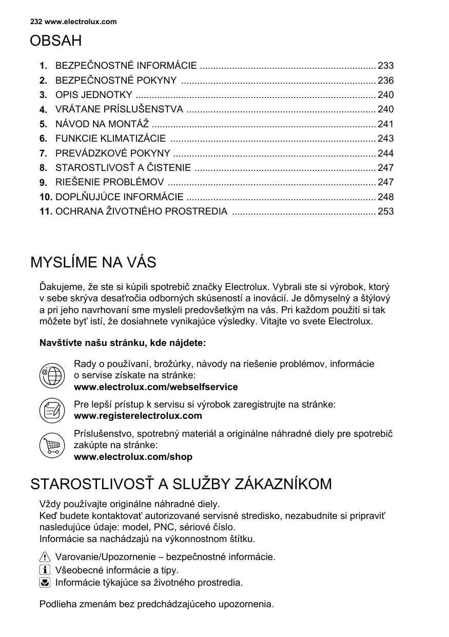 Ďakujeme, že ste si kúpili spotrebič značky Electrolux. Vybrali ste si výrobok, ktorý v sebe skrýva desaťročia odborných skúseností a inovácií. Je dômyselný a štýlový a pri jeho navrhovaní sme mysleli predovšetkým na vás. Pri každom použití si tak môžete byť istí, že dosiahnete vynikajúce výsledky. Vitajte vo svete Electrolux. Navštívte našu stránku, kde nájdete: Rady o používaní, brožúrky, návody na riešenie problémov, informácie o servise získate na stránke: www.electrolux.com/webselfservice Pre lepší prístup k servisu si výrobok zaregistrujte na stránke: www.registerelectrolux.com Príslušenstvo, spotrebný materiál a originálne náhradné diely pre spotrebič zakúpte na stránke: www.electrolux.com/shop STAROSTLIVOSŤ A SLUŽBY ZÁKAZNÍKOM Vždy používajte originálne náhradné diely. Keď budete kontaktovať autorizované servisné stredisko, nezabudnite si pripraviť nasledujúce údaje: model, PNC, sériové číslo. Informácie sa nachádzajú na výkonnostnom štítku. Varovanie/Upozornenie – bezpečnostné informácie. Všeobecné informácie a tipy. Informácie týkajúce sa životného prostredia. Podlieha zmenám bez predchádzajúceho upozornenia. SLOVENSKY