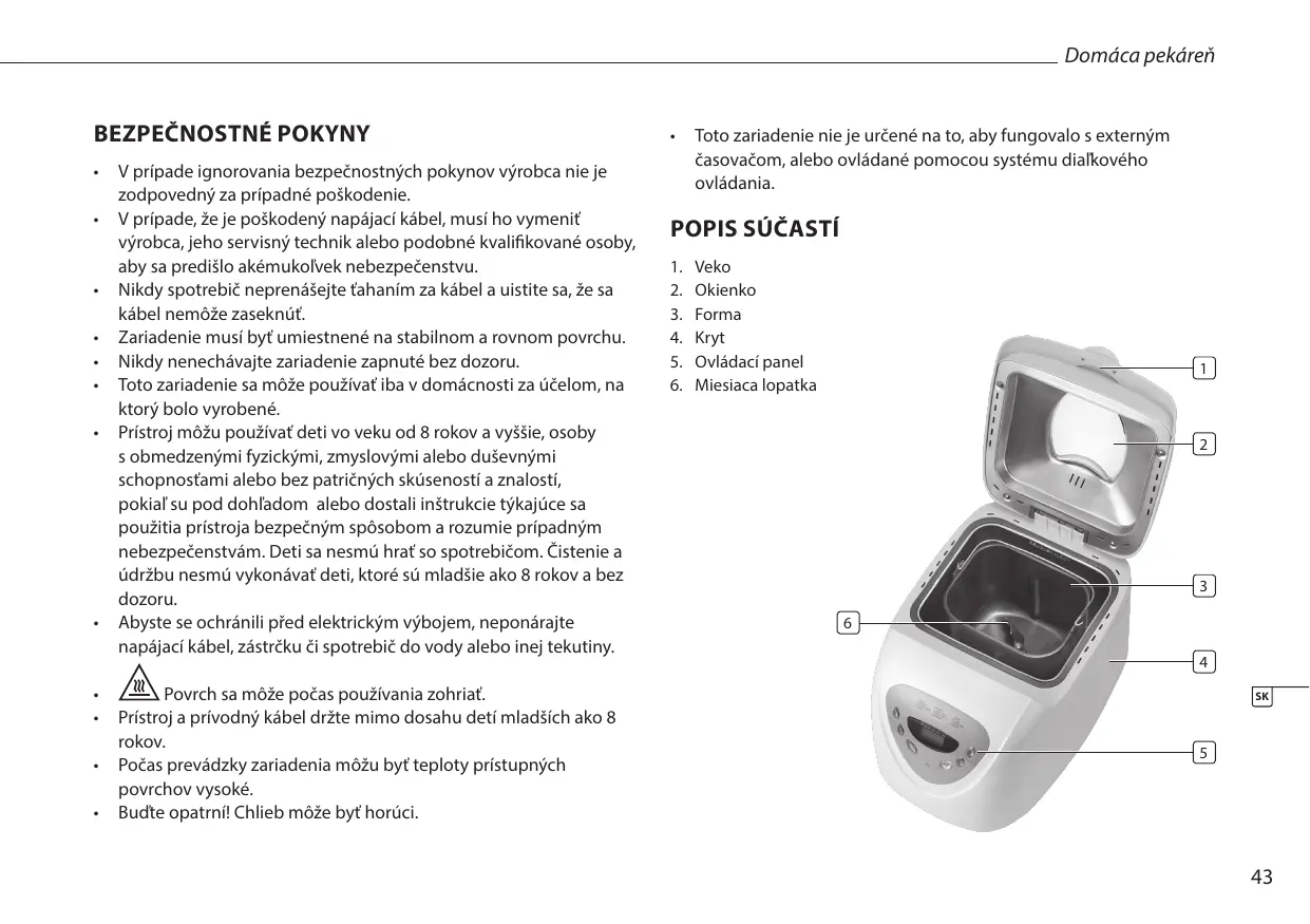 V prípade ignorovania bezpečnostných pokynov výrobca nie je zodpovedný za prípadné poškodenie. V prípade, že je poškodený napájací kábel, musí ho vymeniť výrobca, jeho servisný technik alebo podobné kvalifikované osoby, aby sa predišlo akémukoľvek nebezpečenstvu. Nikdy spotrebič neprenášejte ťahaním za kábel a uistite sa, že sa kábel nemôže zaseknúť. Zariadenie musí byť umiestnené na stabilnom a rovnom povrchu. Nikdy nenechávajte zariadenie zapnuté bez dozoru. Toto zariadenie sa môže používať iba v domácnosti za účelom, na ktorý bolo vyrobené. Prístroj môžu používať deti vo veku od 8 rokov a vyššie, osoby s obmedzenými fyzickými, zmyslovými alebo duševnými schopnosťami alebo bez patričných skúseností a znalostí, pokiaľ su pod dohľadom alebo dostali inštrukcie týkajúce sa použitia prístroja bezpečným spôsobom a rozumie prípadným nebezpečenstvám. Deti sa nesmú hrať so spotrebičom. Čistenie a údržbu nesmú vykonávať deti, ktoré sú mladšie ako 8 rokov a bez dozoru. Abyste se ochránili před elektrickým výbojem, neponárajte napájací kábel, zástrčku či spotrebič do vody alebo inej tekutiny. Povrch sa môže počas používania zohriať. Prístroj a prívodný kábel držte mimo dosahu detí mladších ako 8 rokov. Počas prevádzky zariadenia môžu byť teploty prístupných povrchov vysoké. Buďte opatrní! Chlieb môže byť horúci.