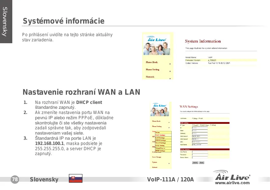 Slovensky VoIP-111A / 120A Slovensky Základné nastavenia Štandardné nastavenia: Webové rozhranie: Maska podsiete:
