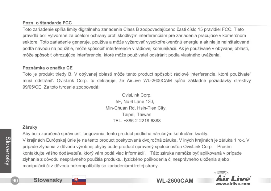 Pozn. o štandarde FCC Toto zariadenie spĺňa limity digitálneho zariadenia Class B zodpovedajúceho časti číslo 15 pravidiel FCC. Tieto pravidlá boli vytvorené za účelom ochrany proti škodlivým interferenciám pre zariadenia pracujúce v komerčnom sektore. Toto zariadenie generuje, používa a môže vyžarovať vysokofrekvenčnú energiu a ak nie je nainštalované podľa návodu na použitie, môže spôsobiť interferencie v rádiovej komunikácii. Ak je používané v obývanej oblasti, môže spôsobiť ohrozujúce interferencie, ktoré môže používateľ odstrániť podľa vlastného uváženia. Poznámka o značke CE Toto je produkt triedy B. V obývanej oblasti môže tento product spôsobiť rádiové interferencie, ktoré používateľ musí odstrániť. OvisLink Corp. tu deklaruje, že AirLive WL-2600CAM spĺňa základné požiadavky direktívy 99/05/CE. Za toto tvrdenie zodpovedá: OvisLink Corp. 5F, No.6 Lane 130, Min-Chuan Rd, Hsin-Tien City, Taipei, Taiwan