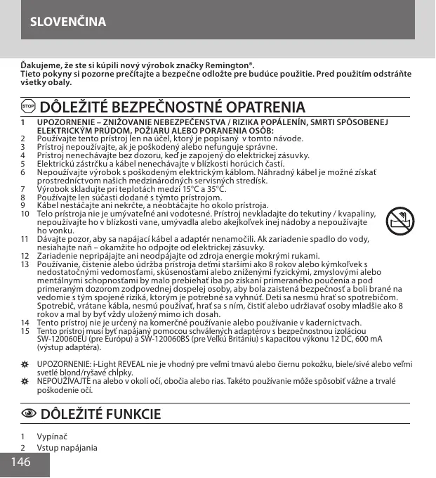 UPOZORNENIE – ZNIŽOVANIE NEBEZPEČENSTVA / RIZIKA POPÁLENÍN, SMRTI SPÔSOBENEJ ELEKTRICKÝM PRÚDOM, POŽIARU ALEBO PORANENIA OSÔB: Používajte tento prístroj len na účel, ktorý je popísaný v tomto návode. Prístroj nepoužívajte, ak je poškodený alebo nefunguje správne. Prístroj nenechávajte bez dozoru, keď je zapojený do elektrickej zásuvky. Elektrickú zástrčku a kábel nenechávajte v blízkosti horúcich častí. Nepoužívajte výrobok s poškodeným elektrickým káblom. Náhradný kábel je možné získať prostredníctvom našich medzinárodných servisných stredísk. Výrobok skladujte pri teplotách medzi 15°C a 35°C. Používajte len súčasti dodané s týmto prístrojom. Kábel nestáčajte ani nekrčte, a neobtáčajte ho okolo prístroja. Telo prístroja nie je umývateľné ani vodotesné. Prístroj nevkladajte do tekutiny / kvapaliny, nepoužívajte ho v blízkosti vane, umývadla alebo akejkoľvek inej nádoby a nepoužívajte ho vonku. Dávajte pozor, aby sa napájací kábel a adaptér nenamočili. Ak zariadenie spadlo do vody, nesiahajte naň – okamžite ho odpojte od elektrickej zásuvky. Zariadenie nepripájajte ani neodpájajte od zdroja energie mokrými rukami. Používanie, čistenie alebo údržba prístroja deťmi staršími ako 8 rokov alebo kýmkoľvek s nedostatočnými vedomosťami, skúsenosťami alebo zníženými fyzickými, zmyslovými alebo mentálnymi schopnosťami by malo prebiehať iba po získaní primeraného poučenia a pod primeraným dozorom zodpovednej dospelej osoby, aby bola zaistená bezpečnosť a boli brané na vedomie s tým spojené riziká, ktorým je potrebné sa vyhnúť. Deti sa nesmú hrať so spotrebičom. Spotrebič, vrátane kábla, nesmú používať, hrať sa s ním, čistiť alebo udržiavať osoby mladšie ako 8 rokov a mal by byť vždy uložený mimo ich dosah. Tento prístroj nie je určený na komerčné používanie alebo používanie v kaderníctvach. Tento prístroj musí byť napájaný pomocou schválených adaptérov s bezpečnostnou izoláciou SW-120060EU (pre Európu) a SW-120060BS (pre Veľkú Britániu) s kapacitou výkonu 12 DC, 600 mA (výstup adaptéra). , UPOZORNENIE: i-Light REVEAL nie je vhodný pre veľmi tmavú alebo čiernu pokožku, biele/sivé alebo veľmi svetlé blond/ryšavé chĺpky. , NEPOUŽÍVAJTE na alebo v okolí očí, obočia alebo rias. Takéto používanie môže spôsobiť vážne a trvalé poškodenie očí.