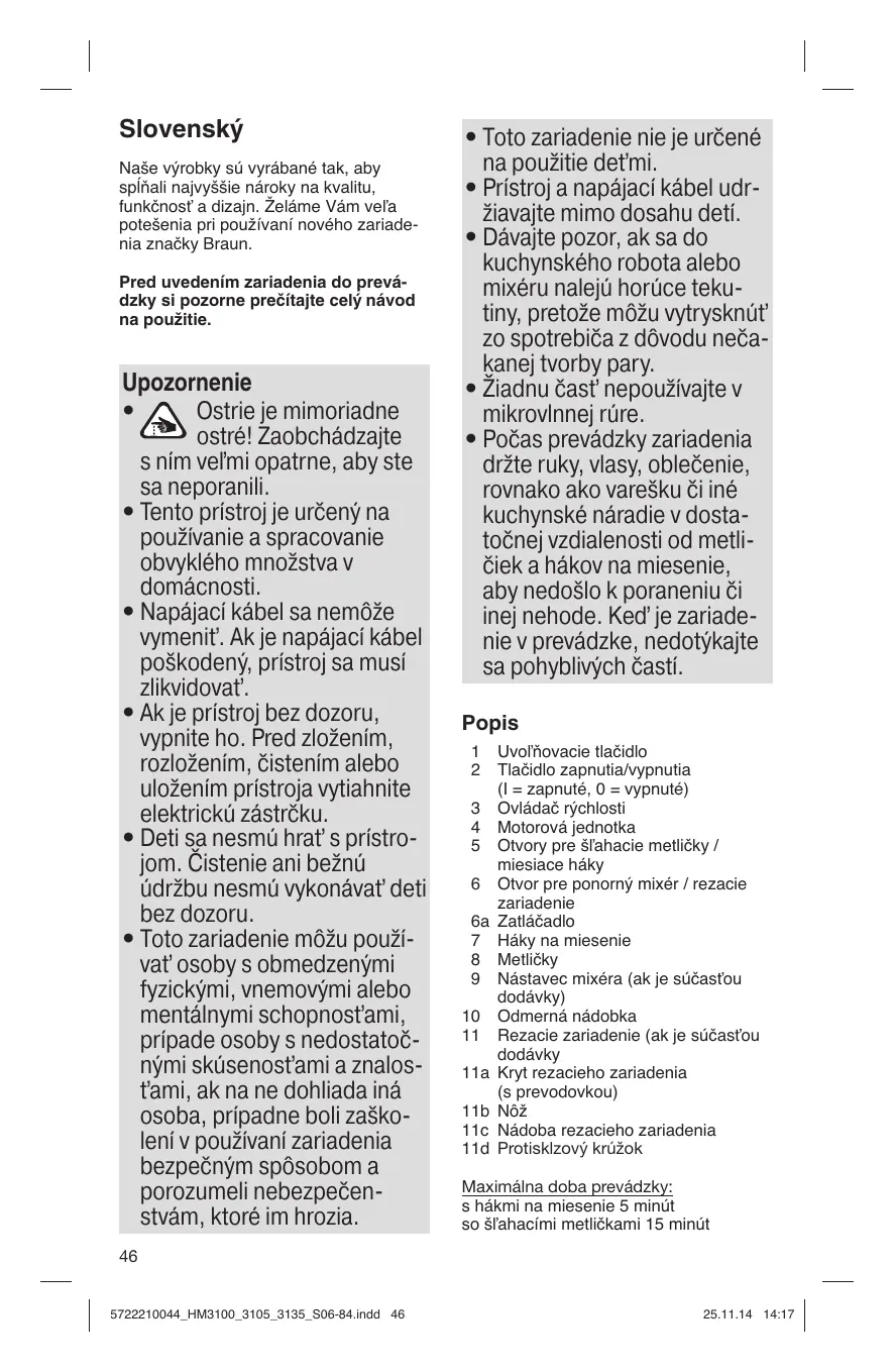 Upozornenie • Ostrie je mimoriadne ostré! Zaobchádzajte s ním veľmi opatrne, aby ste sa neporanili. • Tento prístroj je určený na používanie a spracovanie obvyklého množstva v domácnosti. • Napájací kábel sa nemôže vymeniť. Ak je napájací kábel poškodený, prístroj sa musí zlikvidovať. • Ak je prístroj bez dozoru, vypnite ho. Pred zložením, rozložením, čistením alebo uložením prístroja vytiahnite elektrickú zástrčku. • Deti sa nesmú hrať s prístrojom. Čistenie ani bežnú údržbu nesmú vykonávať deti bez dozoru. • Toto zariadenie môžu používať osoby s obmedzenými fyzickými, vnemovými alebo mentálnymi schopnosťami, prípade osoby s nedostatočnými skúsenosťami a znalosťami, ak na ne dohliada iná osoba, prípadne boli zaškolení v používaní zariadenia bezpečným spôsobom a porozumeli nebezpečenstvám, ktoré im hrozia.