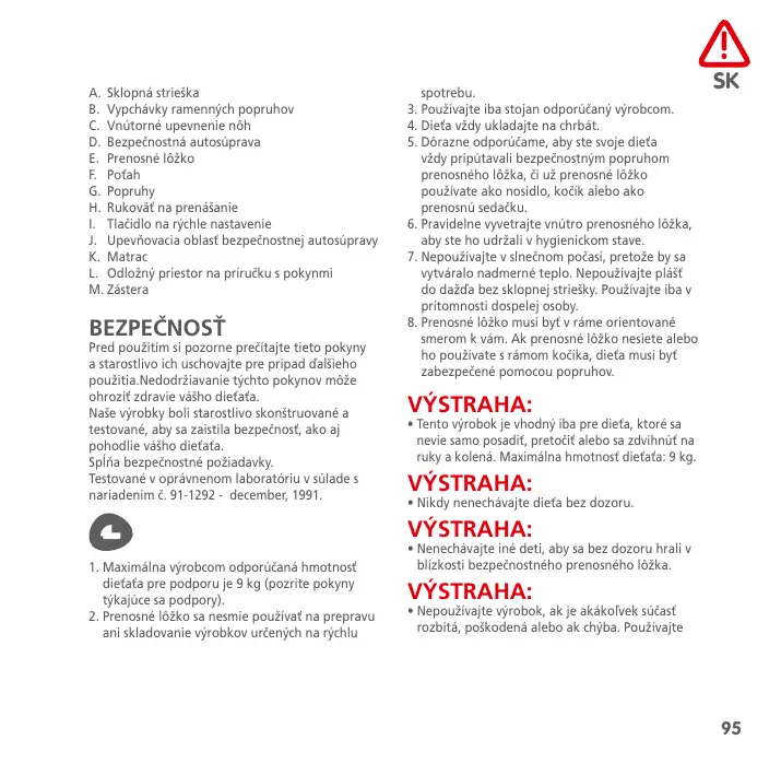 J. Upevňovacia oblasť bezpečnostnej autosúpravy K. Matrac L. Odložný priestor na príručku s pokynmi M. Zástera BEZPEČNOSŤ Pred použitím si pozorne prečítajte tieto pokyny a starostlivo ich uschovajte pre prípad ďalšieho použitia.Nedodržiavanie týchto pokynov môže ohroziť zdravie vášho dieťaťa. Naše výrobky boli starostlivo skonštruované a testované, aby sa zaistila bezpečnosť, ako aj pohodlie vášho dieťaťa. Spĺňa bezpečnostné požiadavky. Testované v oprávnenom laboratóriu v súlade s nariadením č. 91-1292 - december, 1991. spotrebu.