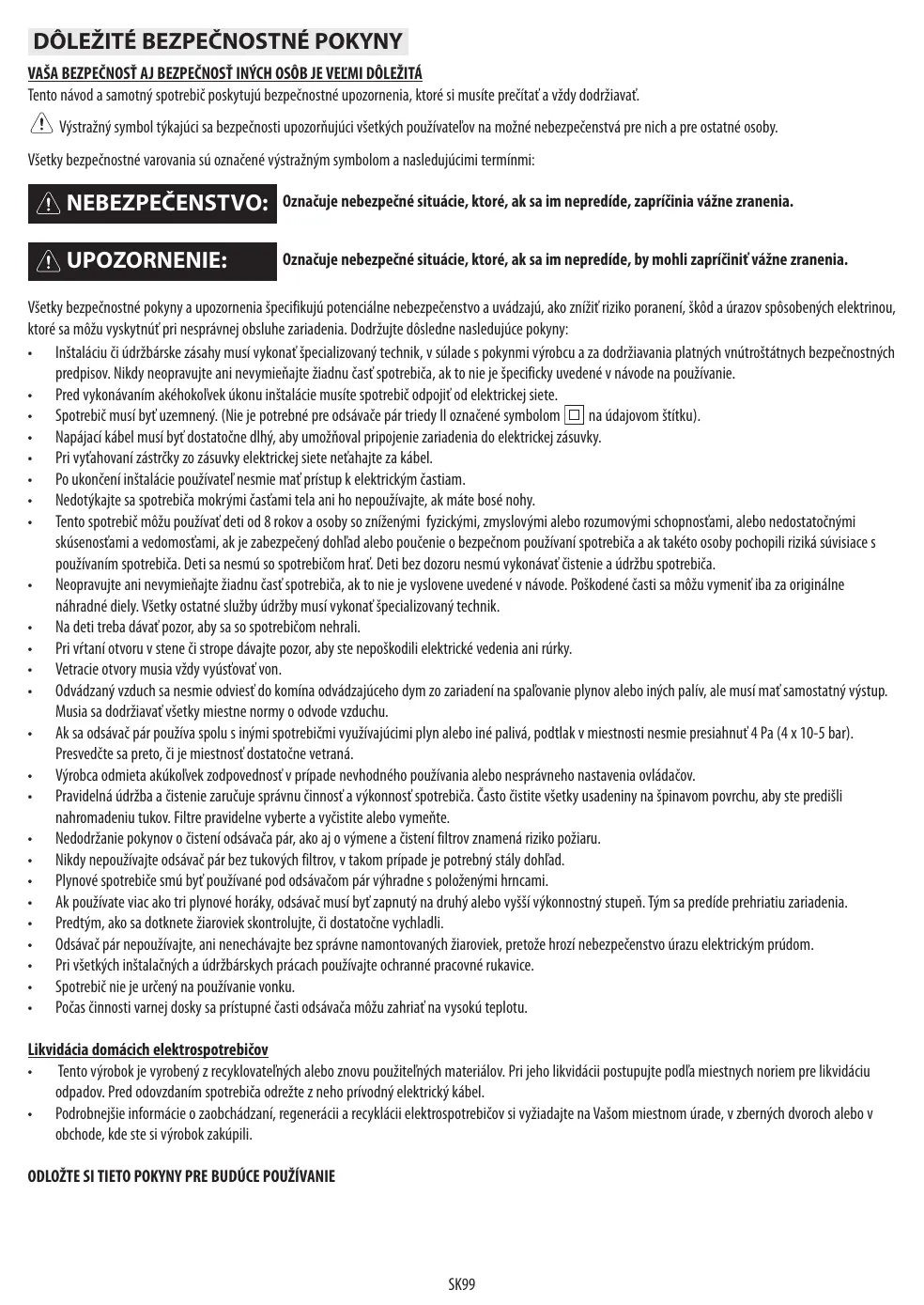 • L’installation et la maintenance doivent être confiées à un technicien spécialisé et exécutées conformément aux instructions du fabricant et aux normes locales de sécurité. Ne pas réparer ni remplacer les pièces de l’appareil qui ne sont pas spécifiquement indiquées dans le manuel d’utilisation. • Débrancher l’appareil de l’alimentation électrique avant de l’installer. • La mise à la terre de l’appareil est obligatoire. Elle n’est pas nécessaire pour les hottes de classe II qui portent le symbole sur l’étiquette signalétique. • Le cordon d’alimentation doit être suffisamment long pour permettre le branchement de l’appareil à la prise électrique. • Ne pas tirer sur le cordon d’alimentation de l’appareil pour le débrancher de la prise. • Une fois l’installation terminée, l’utilisateur ne doit plus pouvoir accéder aux composants électriques. • Ne pas toucher l’appareil quand on est mouillé ou pieds nus. • Cet appareil peut être utilisé par des enfants de plus de huit ans et par des adultes ayant des capacités physiques, sensorielles ou mentales réduites ou inexpérimentées à condition qu’ils soient sous la surveillance d’un responsable ou qu’ils aient reçu des instructions suffisantes pour en comprendre les dangers et assurer leur sécurité. Les enfants ne doivent pas jouer avec l’appareil. Le nettoyage et l’entretien ne doivent pas être confiés à des enfants sauf s’ils sont sous la surveillance d’un adulte. • Ne pas réparer ni remplacer les pièces de l’appareil qui sont pas spécifiquement indiquées dans le manuel. Les composants défectueux doivent être remplacés par des pièces d’origine. Toutes les autres opérations de maintenance doivent être exécutées par un technicien spécialisé. • Surveiller les enfants et vérifier qu’ils ne jouent pas avec l’appareil. • Veiller à ne pas endommager les branchements électriques ou les tuyaux en perçant des trous dans la cloison ou le plafond. • L’évacuation des conduites de ventilation doit déboucher sur l’extérieur. • L’évacuation d’air ne doit pas déboucher dans le conduit de fumée d’un appareil de combustion au gaz (ou autre combustible) mais dans un conduit indépendant. Respecter les normes nationales relatives à l’évacuation des fumées dans l’atmosphère. • Si la hotte est utilisée en même temps que des appareils alimentés au gaz (ou autre combustible), la dépression dans la pièce ne doit pas dépasser 4 Pa (4 x 10-5 bar) S’assurer que la pièce est correctement ventilée. • Le fabricant décline toute responsabilité pour les dommages résultant d’une utilisation impropre ou d’un réglage erroné des commandes. • Un entretien et un nettoyage réguliers garantissent le bon fonctionnement et le rendement de la hotte. Nettoyer régulièrement les dépôts sur les surfaces sales pour éviter l’accumulation des graisses. Enlever et nettoyer ou remplacer fréquemment le filtre. • Le non respect des normes d’entretien de la hotte, de remplacement et de nettoyage des filtres, peut provoquer un incendie. • La hotte d’aspiration de la vapeur ne doit pas être ouverte si les filtres à graisse ne sont pas installés et doit être constamment surveillée. • Les appareils à gaz ne peuvent être utilisés sous la hotte d’aspiration que si une casserole est posée dessus. • Si plus de trois points de cuisson au gaz sont utilisés en même temps, la hotte doit être réglée au moins sur la puissance 2. Ce réglage permet d’éviter la stagnation de chaleur dans l’appareil. • S’assurer que les lampes sont froides avant de les toucher. • Ne pas utiliser la hotte sans les lampes ou si elles ne sont pas installées correctement pour éviter tout risque l’électrocution. • Porter des gants de travail pour les opérations d’installation et d’entretien. • Cet appareil n’est pas conçu pour être utilisé à l’extérieur • Lorsque la table de cuisson fonctionne, les parties accessibles de la hotte peuvent devenir très chaudes. Mise au rebut des appareils électroménagers • Cet appareil a été fabriqué avec des matériaux recyclables ou réutilisables. Mettre l’appareil au rebut conformément aux normes locales d’élimination des déchets. Avant d’éliminer l’appareil, le rendre inutilisable en coupant le cordon d’alimentation. • Pour toute information sur le traitement, la récupération et le recyclage des appareils électroménagers, s’adresser à l’administration locale compétente, au service de collecte des déchets ou au magasin où il a été acheté CONSERVER CES INSTRUCTIONS F15
