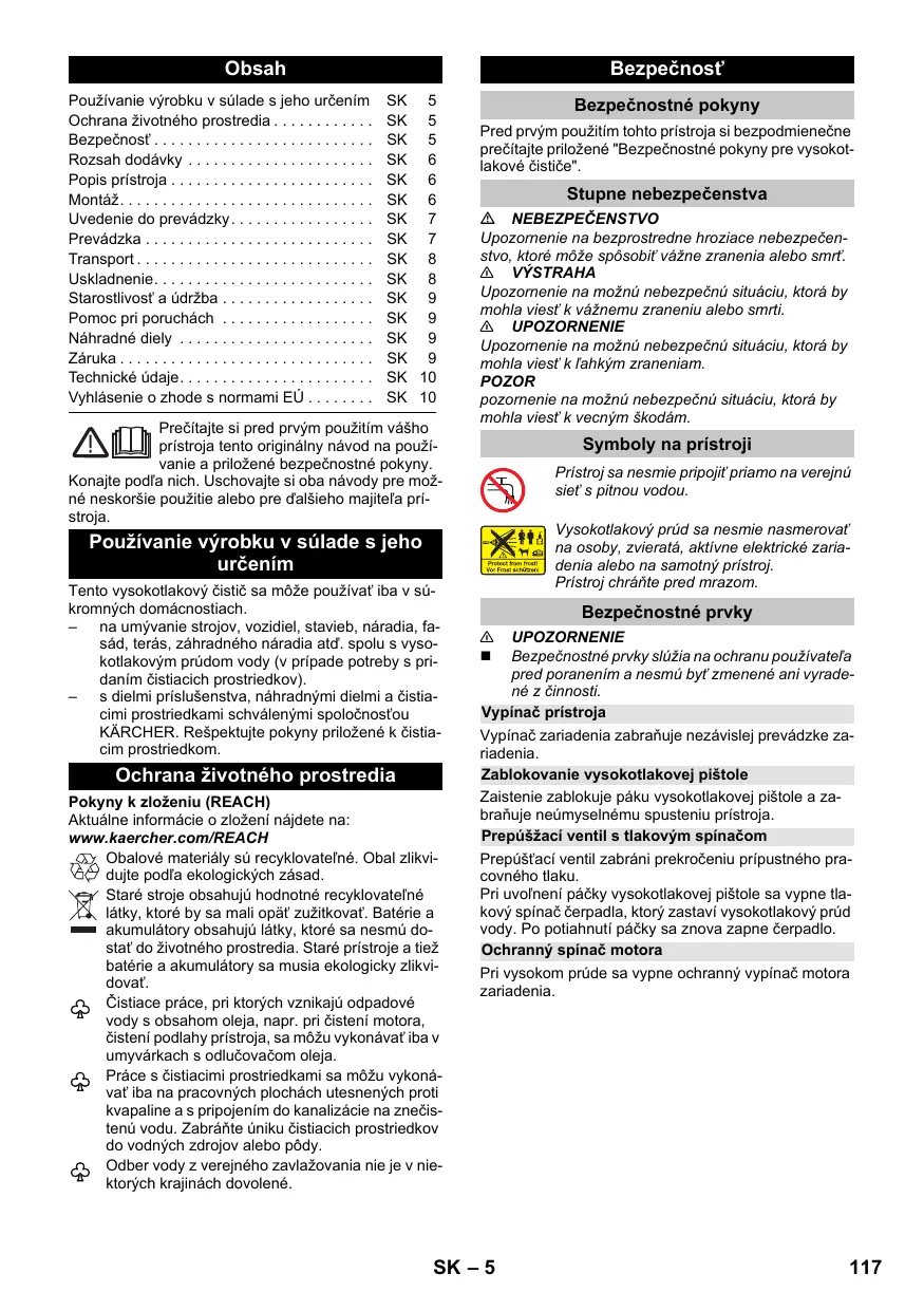 EN 60335–2–79 EN 61000–3–2: 2014 EN 61000–3–3: 2013 EN 62233: 2008 Procedimiento de evaluación de la conformidad aplicado 2000/14/CE: Anexo V Nivel de potencia acústica dB(A) Medido: 88 Garantizado: EN 60335–1 EN 60335–2–79 EN 61000–3–2: 2014 EN 61000–3–3: 2013 EN 62233: 2008 Processo aplicado de avaliação de conformidade 2000/14/CE: Anexo V Nível de potência acústica dB(A) Medido: 88 EN 60335–1 EN 60335–2–79 EN 61000–3–2: 2014 EN 61000–3–3: 2013 EN 62233: 2008 Anvendte overensstemmelsesvurderingsprocedurer 2000/14/EF: Bilag V Lydeffektniveau dB(A) Målt: EN 60335–1 EN 60335–2–79 EN 61000–3–2: 2014 EN 61000–3–3: 2013 EN 62233: 2008 Anvendt metode for samsvarsvurdering 2000/14/EF: Vedlegg V Lydeffektnivå dB(A) Målt: EN 60335–1 EN 60335–2–79 EN 61000–3–2: 2014 EN 61000–3–3: 2013 EN 62233: 2008 Tillämpad metod för överensstämmelsevärdering 2000/14/EG: Bilaga V Ljudeffektsnivå dB(A) Upmätt: EN 60335–1 EN 60335–2–79 EN 61000–3–2: 2014 EN 61000–3–3: 2013 EN 62233: 2008 Sovellettu yhdenmukaisuuden analysointimenetelmä 2000/14/EY: Liite V Äänen tehotaso dB(A) EN 60335–1 EN 60335–2–79 EN 61000–3–2: 2014 EN 61000–3–3: 2013 EN 62233: 2008 Εφαρμοσθείσα διαδικασία συμμόρφωσης 2000/14/EΚ: Παράρτημα V στάθμη ηχητικής πίεσης dB(A) EN 60335–1 EN 60335–2–79 EN 61000–3–2: 2014 EN 61000–3–3: 2013 EN 62233: 2008 Kullanılan uyumluluk değerlendirme yöntemleri 2000/14/EG: Ek V Ses şiddeti dB(A) Ölçülen: 88 EN 60335–1 EN 60335–2–79 EN 61000–3–2: 2014 EN 61000–3–3: 2013 EN 62233: 2008 Примененный порядок оценки соответствия 2000/14/ЕС: Приложение V Уровень мощности звука dB(A) EN 60335–1 EN 60335–2–79 EN 61000–3–2: 2014 EN 61000–3–3: 2013 EN 62233: 2008 Követett megfelelés megállapítási eljárás: 2000/14/EK: V. függelék Hangteljesítményszint dB(A) EN 60335–1 EN 60335–2–79 EN 61000–3–2: 2014 EN 61000–3–3: 2013 EN 62233: 2008 Použitý postup posuzování shody: 2000/14/ES: Příloha V Hladinu akustického dB(A) Namerenou: EN 60335–1 EN 60335–2–79 EN 61000–3–2: 2014 EN 61000–3–3: 2013 EN 62233: 2008 Postopek ocenjevanja skladnosti: 2000/14/ES: Priloga V Raven zvočne moči dB(A) Izmerjeno: EN 60335–1 EN 60335–2–79 EN 61000–3–2: 2014 EN 61000–3–3: 2013 EN 62233: 2008 Zastosowana metoda oceny zgodności 2000/14/WE: Załącznik V Poziom mocy akustycznej dB(A) Zmierzony: Trepte de pericol  PERICOL Indicaţie referitoare la un pericol iminent, care duce la vătămări corporale grave sau moarte. 몇 AVERTIZARE Indicaţie referitoare la o posibilă situaţie periculoasă, care ar putea duce la vătămări corporale grave sau moarte. 몇 PRECAUŢIE Indică o posibilă situaţie periculoasă, care ar putea duce la vătămări corporale uşoare. ATENŢIE Indicaţie referitoare la o posibilă situaţie periculoasă, care ar putea duce la pagube materiale.  Conectaţi furtunul de apă la sursa de alimentare cu apă.  Deschideţi robinetul de apă în totalitate. Aspirarea apei din rezervoare deschise Acest aparat de curăţat sub presiune poate fi folosit cu furtunul de absorbţie KÄRCHER cu supapă de refulare (accesoriu special, nr. de comandă 2.643-100) şi este adecvat pentru aspirarea apei de la suprafaţă, de ex. din rezervoare cu apă de ploaie sau din iazuri (înălţimea maximă de aspirare vezi Datele tehnice). Indicaţie: În regim de aspirare nu este nevoie de cuplajul racordului de apă.  Umpleţi cu apă furtunul de aspirare.  Înşurubaţi furtunul de aspirare pe racordul de apă al aparatului şi atârnaţi-l într-un recipient cu apă (de ex. rezervorul de apă de ploaie). Evacuaţi aerul înainte de a utiliza aparatul după cum urmează:  Porniţi aparatul „I/ON“.  Deblocaţi maneta pistolului de pulverizat.  Apăsaţi maneta pistolului manual de pulverizat, aparatul porneşte.  Mizeria desprinsă se spală cu jetul de înaltă presiune. După utilizarea cu soluţie de curăţat  Scoateţi flaconul Plug 'n' Clean din suport şi închideţi-l cu dop.  Pentru depozitare aşezaţi flaconul de soluţie de curăţat cu dopul în sus în suport.