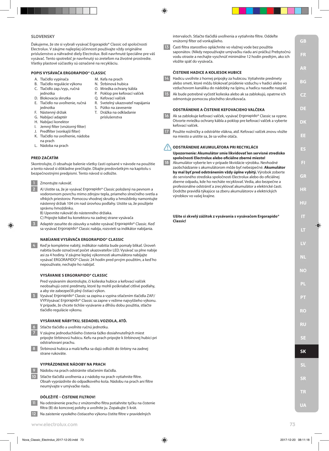 DE DK EE ES FI GR HR HU IT LT LV NL NO PL PT RO Akumulátor sa musí pred likvidáciou odstrániť zo spotrebiča. Postarajte sa o bezpečnú likvidáciu akumulátora/batérie. Používajte iba nabíjací adaptér, ktorý bol dodaný s výrobkom. Vysávač Ergorapido® Classic sa smie používať len na bežné vysávanie vo vnútri a v domácom prostredí. Uistite sa, že vysávač skladujete na suchom mieste. Obalový materiál, napr. plastové vrecká, udržiavajte mimo dosahu detí, aby ste predišli uduseniu. Vysávač nikdy nepoužívajte: • na vlhkých miestach, • blízko horľavých plynov a pod., • keď spotrebič vykazuje viditeľné znaky poškodenia, • na vysávanie ostrých predmetov ani tekutín, • na horúci ani studený popol, zapálené cigaretové ohorky a pod., • na jemný prach, napríklad zo stierky, betónu, múky, horúceho alebo studeného popola. Pozor: • Nenechávajte vysávač na priamom slnečnom svetle. • Nevystavujte vysávač silnému teplu. • Články akumulátora sa nesmú rozoberať, skratovať ani umiestňovať na kovový povrch. • Vysávač nepoužívajte bez filtrov. • Keď je vysávač zapnutý a kefovací valček sa otáča, nedotýkajte sa kefovacieho valčeka. • Dávajte si pozor na prsty, ak čistíte vnútornú stranu hubici na podlahu.