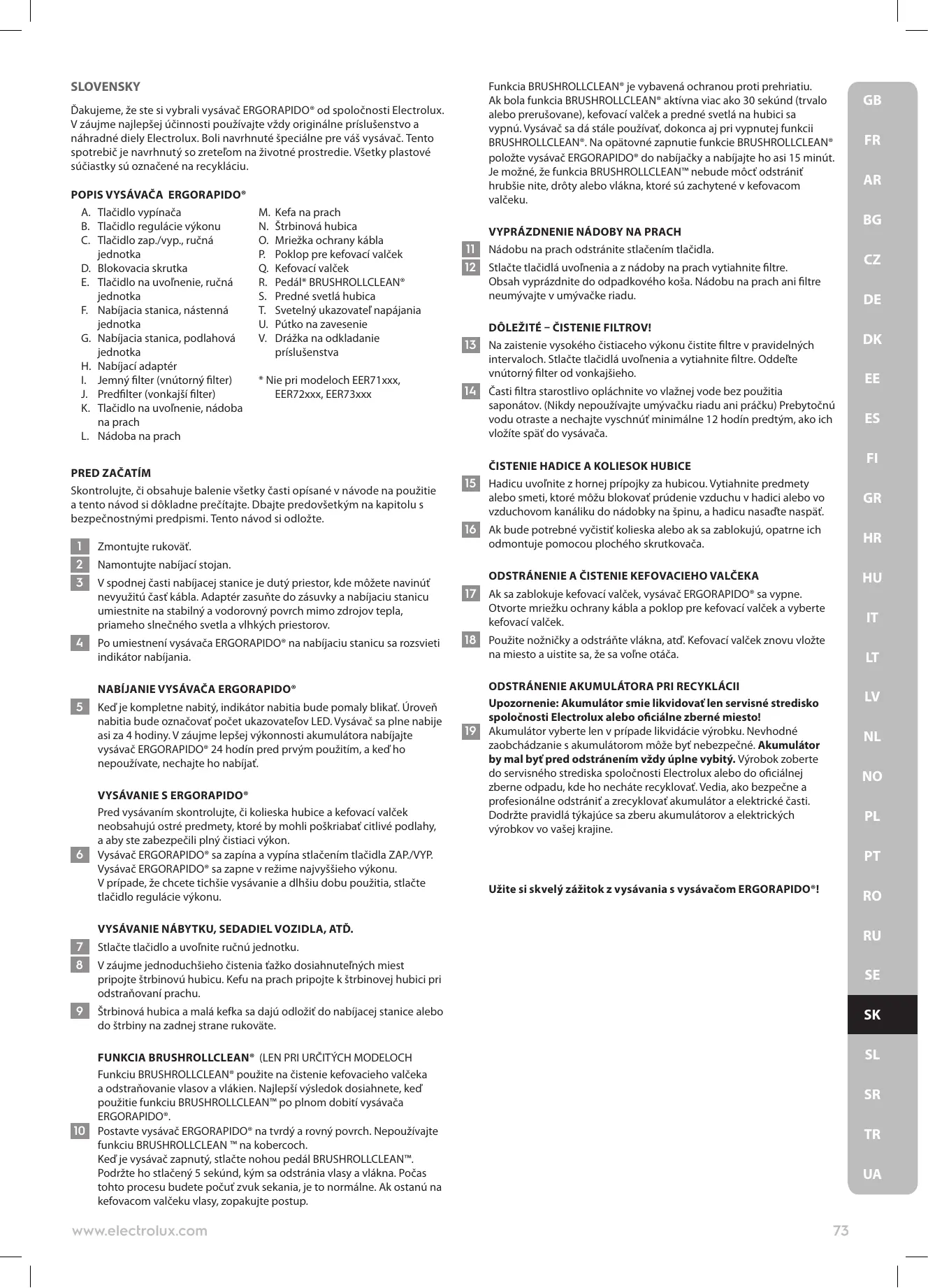 DE DK EE ES FI GR HR HU IT LT LV NL NO Akumulátor sa musí pred likvidáciou odstrániť zo spotrebiča. Postarajte sa o bezpečnú likvidáciu akumulátora/batérie. Používajte iba nabíjací adaptér, ktorý bol dodaný s výrobkom. Vysávač ERGORAPIDO® sa smie používať len na bežné vysávanie vo vnútri a v domácom prostredí. Uistite sa, že vysávač skladujete na suchom mieste. Obalový materiál, napr. plastové vrecká, udržiavajte mimo dosahu detí, aby ste predišli uduseniu. Vysávač nikdy nepoužívajte: • na vlhkých miestach, • blízko horľavých plynov a pod., • keď spotrebič vykazuje viditeľné znaky poškodenia, • na vysávanie ostrých predmetov ani tekutín, • na horúci ani studený popol, zapálené cigaretové ohorky a pod., • na jemný prach, napríklad zo stierky, betónu, múky, horúceho alebo studeného popola. Pozor: • Nenechávajte vysávač na priamom slnečnom svetle. • Nevystavujte vysávač silnému teplu. • Články akumulátora sa nesmú rozoberať, skratovať ani umiestňovať na kovový povrch. • Vysávač nepoužívajte bez filtrov. • Keď je vysávač zapnutý a kefovací valček sa otáča, nedotýkajte sa kefovacieho valčeka. • Dávajte si pozor na prsty, ak čistíte vnútornú stranu hubici na podlahu. Kovová čepeľ funkcie BRUSHROLLCLEAN® je ostrá a mohli by ste sa poraniť.
