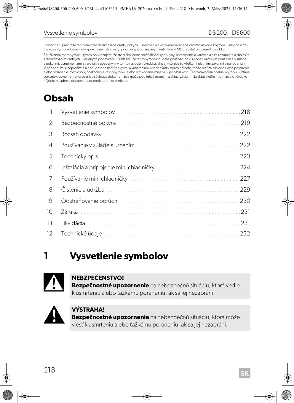 VÝSTRAHA! Nedodržanie týchto varovaní môže mať za následok smrť alebo vážne poranenie. Nebezpečenstvo úrazu elektrickým prúdom • Postarajte sa, aby mini chladničku nainštaloval kvalifikovaný technik podľa návodu na montáž firmy Dometic. • Ak mini chladnička vykazuje viditeľné poškodenia, nesmiete ju uviesť do prevádzky. • Ak je pripájací kábel mini chladničky poškodený, musí jeho výmenu vykonať výrobca, servisný technik alebo podobne spôsobilá osoba, aby sa predišlo bezpečnostným rizikám. • Opravy na tejto mini chladničke smú vykonávať len kvalifikovaní odborníci. Neodborné opravy predstavujú riziko vážnych nebezpečenstiev. Nebezpečenstvo požiaru • Chladiaci prostriedok v chladiacom okruhu je vysoko horľavý. V prípade poškodenia chladiaceho okruhu: – Vypnite mini chladničku. – Nepoužívajte otvorený oheň a zabráňte vzniku iskier. – Dobre vyvetrajte priestor.