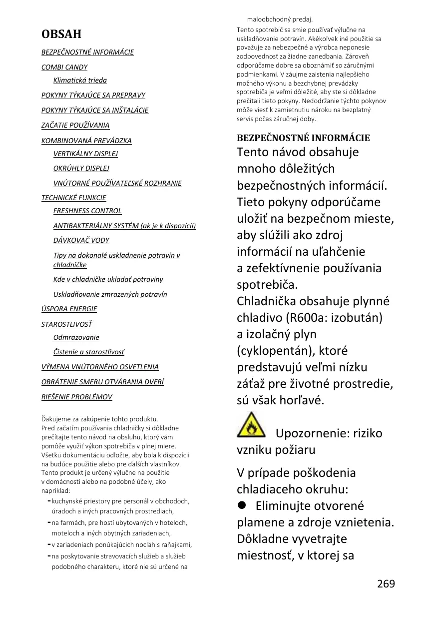 Tento návod obsahuje mnoho dôležitých bezpečnostných informácií. Tieto pokyny odporúčame uložiť na bezpečnom mieste, aby slúžili ako zdroj informácií na uľahčenie a zefektívnenie používania spotrebiča. Chladnička obsahuje plynné chladivo (R600a: izobután) a izolačný plyn (cyklopentán), ktoré predstavujú veľmi nízku záťaž pre životné prostredie, sú však horľavé. Upozornenie: riziko vzniku požiaru V prípade poškodenia chladiaceho okruhu: Eliminujte otvorené plamene a zdroje vznietenia. Dôkladne vyvetrajte miestnosť, v ktorej sa podobného charakteru, ktoré nie sú určené na