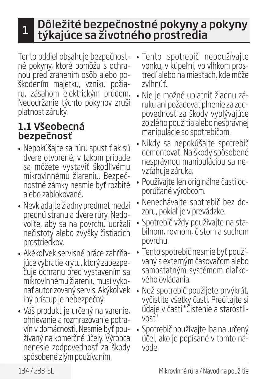 135 / 233 SL Dôležité bezpečnostné pokyny a pokyny 1 týkajúce sa životného prostredia •• Spotrebič