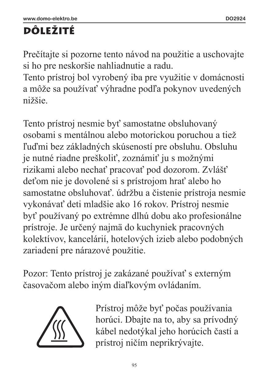Tento prístroj nesmie byt' samostatne obsluhovany osobami s mentalnou alebo motorickou poruchou a tiež l'dmi bez základnych skúsenosti pre obsluhu. Obsluhu je nutné riadne preškolit', zoznámit' ju s możnymi rizikami alebo nechat' pracovat' pod dozorom. Zvlást' det'am nie je dovolné si s prístrojom hrat' alebo ho samostatne obsluhovat'. udržbu a Čistenie prístroja nesmie vykonávat' deti mladsie aka 16 rokov. Prístroj nesmie byt' použivaný po extrémne dlhú dobu ako profesiónáne prístroje. Je určeny majmä do kuchyniek pracovnych kolektivov, kancelárií, hotelovych izieb alebo podobnych zariadení pre nárazové použitie.
