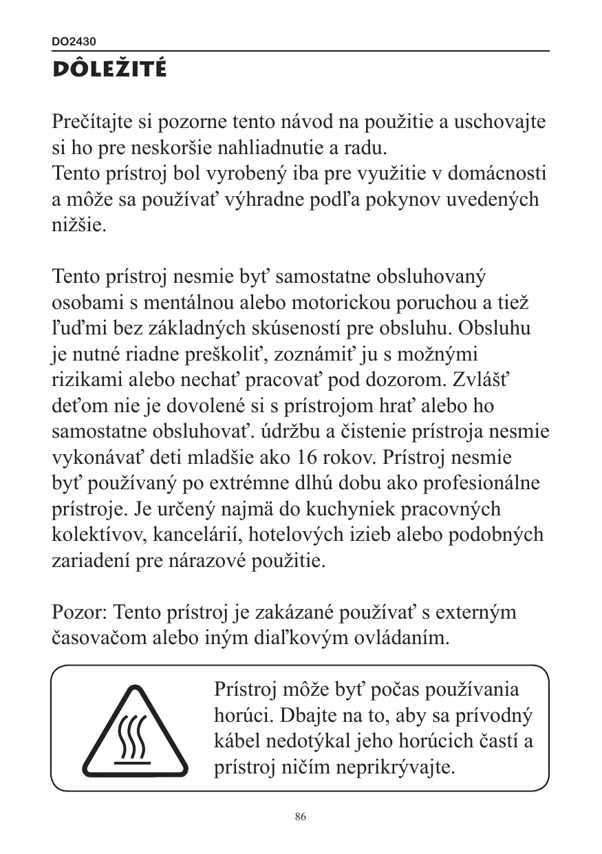 Prečítajte si pozorne tento návod na použitie a uschovajte si ho pre neskoršie nahliadnutie a radu. Tento prístroj bol vyrobený iba pre využitie v domácnosti a môže sa používať výhradne podľa pokynov uvedených nižšie. Tento prístroj nesmie byť samostatne obsluhovaný osobami s mentálnou alebo motorickou poruchou a tiež ľuďmi bez základných skúseností pre obsluhu. Obsluhu je nutné riadne preškoliť, zoznámiť ju s možnými rizikami alebo nechať pracovať pod dozorom. Zvlášť deťom nie je dovolené si s prístrojom hrať alebo ho samostatne obsluhovať. údržbu a čistenie prístroja nesmie vykonávať deti mladšie ako 16 rokov. Prístroj nesmie byť používaný po extrémne dlhú dobu ako profesionálne prístroje. Je určený najmä do kuchyniek pracovných kolektívov, kancelárií, hotelových izieb alebo podobných zariadení pre nárazové použitie. Pozor: Tento prístroj je zakázané používať s externým časovačom alebo iným diaľkovým ovládaním. Prístroj môže byť počas používania horúci. Dbajte na to, aby sa prívodný kábel nedotýkal jeho horúcich častí a prístroj ničím neprikrývajte.