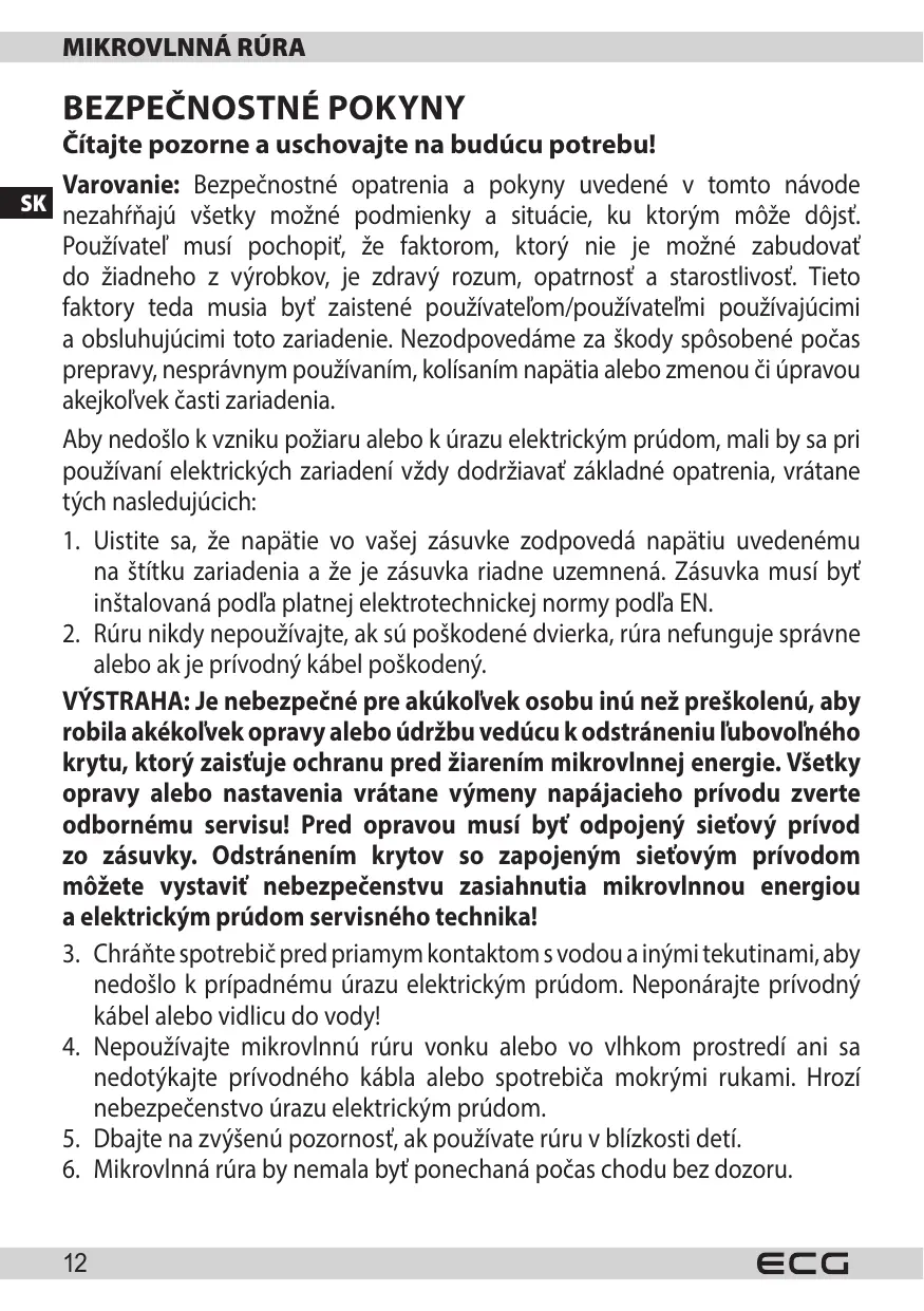 VÍSTRAHA: Je nebezpećné pre akúkol'vek osobu inú než preskolenú, aby robila akékol'vek opravy alebo Údržbu vedúcu k odstráneniu lubovolného krytu, ktorý zaistuju ochranu pred ziarením mikrovlnnej energia. Vsetky opravy alebo nastavenia vrátane výmeny napájacieho privodu zverte odbornému servisu! Pred opravou musí byt odpojený sietový privod zo zásuvky. Odstrányím krytov so zapojený sietovým privodom mözete vystavit nebezpečenstvu zasiahnutia mikrovlnnou energiou a elektrickým prudom servisného technika!