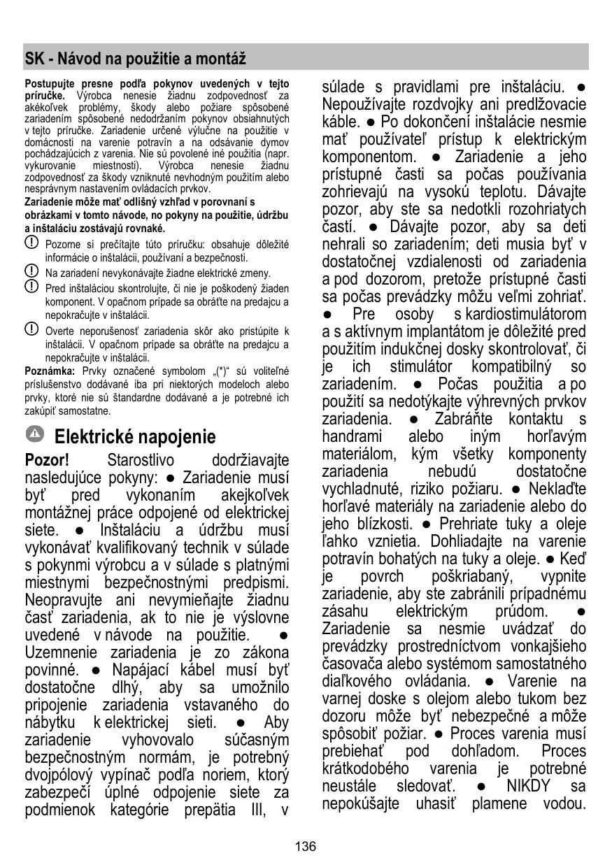 SK - Návod na použitie a montáž súlade s pravidlami pre inštaláciu. ● Nepoužívajte rozdvojky ani predlžovacie káble. ● Po dokončení inštalácie nesmie mať používateľ prístup k elektrickým komponentom. ● Zariadenie a jeho prístupné časti sa počas používania zohrievajú na vysokú teplotu. Dávajte pozor, aby ste sa nedotkli rozohriatych častí. ● Dávajte pozor, aby sa deti nehrali so zariadením; deti musia byť v dostatočnej vzdialenosti od zariadenia a pod dozorom, pretože prístupné časti sa počas prevádzky môžu veľmi zohriať. ● Pre osoby s kardiostimulátorom a s aktívnym implantátom je dôležité pred použitím indukčnej dosky skontrolovať, či je ich stimulátor kompatibilný so zariadením. ● Počas použitia a po použití sa nedotýkajte výhrevných prvkov zariadenia. ● Zabráňte kontaktu s handrami alebo iným horľavým materiálom, kým všetky komponenty zariadenia nebudú dostatočne vychladnuté, riziko požiaru. ● Neklaďte horľavé materiály na zariadenie alebo do jeho blízkosti. ● Prehriate tuky a oleje ľahko vznietia. Dohliadajte na varenie potravín bohatých na tuky a oleje. ● Keď je povrch poškriabaný, vypnite zariadenie, aby ste zabránili prípadnému zásahu elektrickým prúdom. ● Zariadenie sa nesmie uvádzať do prevádzky prostredníctvom vonkajšieho časovača alebo systémom samostatného diaľkového ovládania. ● Varenie na varnej doske s olejom alebo tukom bez dozoru môže byť nebezpečné a môže spôsobiť požiar. ● Proces varenia musí prebiehať pod dohľadom. Proces krátkodobého varenia je potrebné neustále sledovať. ● NIKDY sa nepokúšajte uhasiť plamene vodou.