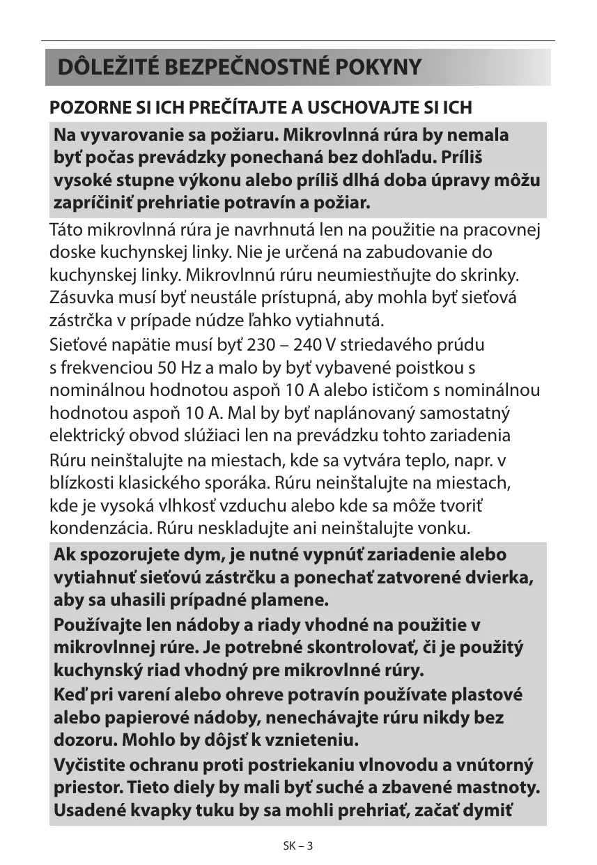 élément de cuisine. Veuillez ne pas placer le four dans un placard. La prise secteur doit être facilement accessible, afin que la fiche du cordon d’alimentation puisse être aisément débranchée en cas d’urgence. La tension d’alimentation doit être égale à 230-240 V, 50 Hz avec un fusible de distribution de 10 A minimum, ou un disjoncteur de 10 A minimum. La prise secteur doit être facilement accessible, afin que la fiche du cordon d’alimentation puisse être aisément débranchée en cas d’urgence. Veuillez ne pas placer votre four à proximité d’une zone génératrice de chaleur. Par exemple, près d’un four à cuisson conventionnelle. Ne placez pas ce four dans une atmosphère à humidité élevée ou bien où l’humidité peut s'accumuler. Ne stockez et n'utilisez pas le four à l’extérieur. Si vous observez la présence de fumée, éteignez ou débranchez le four et laissez la porte fermée afin d’étouffer les flammes. Utilisez uniquement des récipients et ustensiles compatibles avec la cuisson au micro-ondes. Il est important de vérifier que les ustensiles utilisés soient bien compatibles avec la cuisson au micro-ondes. Lorsque vous réchauffez un plat dans un récipient en plasFR – 3