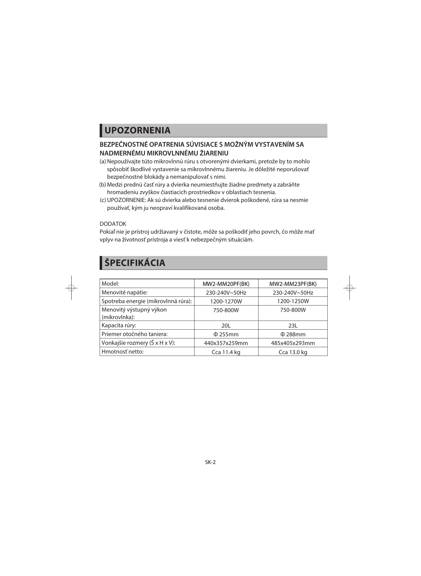 MW2-MM20PF(BK) MW2-MM23PF(BK) Pred použitím mikrovlnnej rúry si pozorne prečítajte tento návod a starostlivo si ho uschovajte. Ak budete postupovať podľa týchto pokynov, vaša mikrovlnná rúra vám bude dobre slúžiť po dlhé roky. TENTO NÁVOD SI STAROSTLIVO USCHOVAJTE!