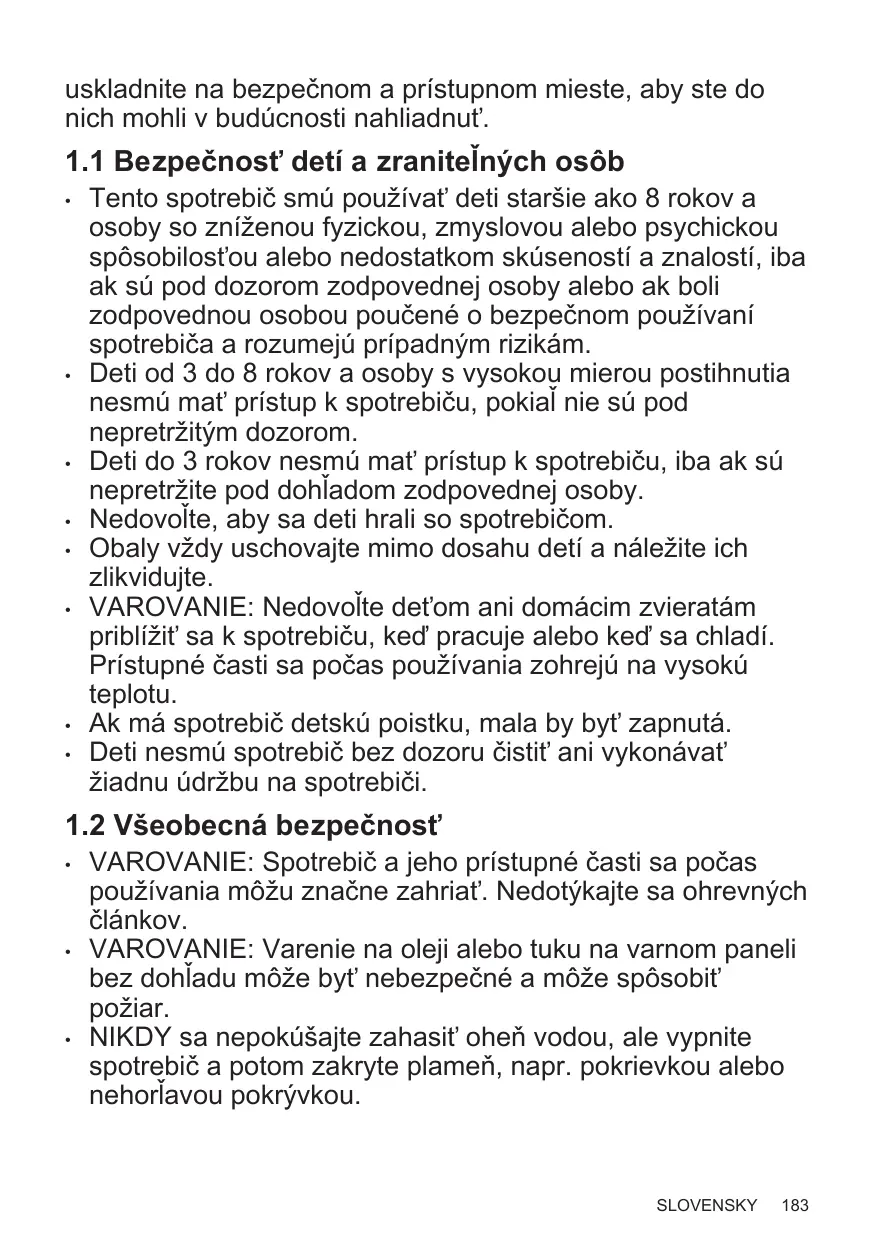 VAROVANIE: Spotrebič a jeho prístupné časti sa počas používania môžu značne zahriať. Nedotýkajte sa ohrevných článkov. VAROVANIE: Varenie na oleji alebo tuku na varnom paneli bez dohľadu môže byť nebezpečné a môže spôsobiť požiar. NIKDY sa nepokúšajte zahasiť oheň vodou, ale vypnite spotrebič a potom zakryte plameň, napr. pokrievkou alebo nehorľavou pokrývkou. SLOVENSKY