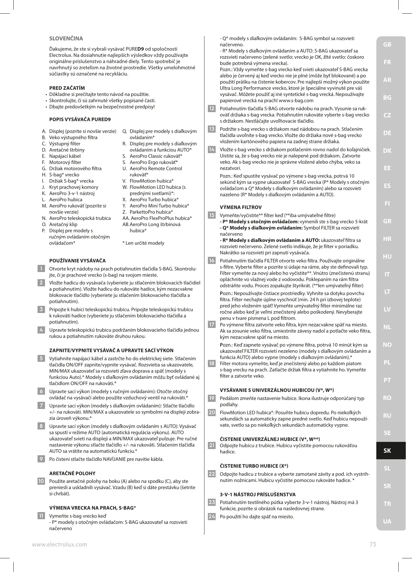 SLOVENČINA - Q* modely s diaľkovým ovládaním: S-BAG symbol sa rozsvieti načerveno. - R* Modely s diaľkovým ovládaním a AUTO: S-BAG ukazovateľ sa rozsvieti načerveno (zelené svetlo: vrecko je OK, žlté svetlo: čoskoro bude potrebná výmena vrecka). Pozn.: Vždy vymeňte s-bag vrecko keď svieti ukazovateľ S-BAG vrecka alebo je červený aj keď vrecko nie je plné (môže byť blokované) a po použití prášku na čistenie kobercov. Pre najlepší možný výkon použite Ultra Long Performance vrecko, ktoré je špeciálne vyvinuté pre váš vysávač. Môžete použiť aj iné syntetické s-bag vrecká. Nepoužívajte papierové vrecká na prach! www.s-bag.com Ďakujeme, že ste si vybrali vysávač PURED9 od spoločnosti Electrolux. Na dosiahnutie najlepších výsledkov vždy používajte originálne príslušenstvo a náhradné diely. Tento spotrebič je navrhnutý so zreteľom na životné prostredie. Všetky umelohmotné súčiastky sú označené na recykláciu.