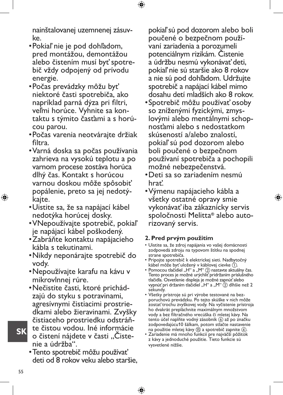nainštalovanej uzemnenej zásuvpokiaľ sú pod dozorom alebo boli ke. poučené o bezpečnom použí• Pokiaľ nie je pod dohľadom, vaní zariadenia a porozumeli pred montážou, demontážou potenciálnym rizikám. Čistenie alebo čistením musí byť spotrea údržbu nesmú vykonávať deti, bič vždy odpojený od prívodu pokiaľ nie sú staršie ako 8 rokov energie. a nie sú pod dohľadom. Udržujte • Počas prevádzky môžu byť spotrebič a napájací kábel mimo niektoré časti spotrebiča, ako dosahu detí mladších ako 8 rokov. napríklad parná dýza pri filtri, • Spotrebič môžu používať osoby veľmi horúce. Vyhnite sa konso zníženými fyzickými, zmystaktu s týmito časťami a s horú- lovými alebo mentálnymi schopcou parou. nosťami alebo s nedostatkom • Počas varenia neotvárajte držiak skúseností a/alebo znalostí, filtra. pokiaľ sú pod dozorom alebo • Varná doska sa počas používania boli poučené o bezpečnom zahrieva na vysokú teplotu a po používaní spotrebiča a pochopili varnom procese zostáva horúca možné nebezpečenstvá. dlhý čas. Kontakt s horúcou • Deti sa so zariadením nesmú varnou doskou môže spôsobiť hrať. popálenie, preto sa jej nedotý• Výmenu napájacieho kábla a kajte. všetky ostatné opravy smie • Uistite sa, že sa napájací kábel vykonávať iba zákaznícky servis nedotýka horúcej dosky. spoločnosti Melitta® alebo auto• VNepoužívajte spotrebič, pokiaľ rizovaný servis. je napájací kábel poškodený. • Zabráňte kontaktu napájacieho 2. Pred prvým použitím • Uistite sa, že zdroj napájania vo vašej domácnosti kábla s tekutinami. zodpovedá zdroju na typovom štítku na spodnej strane spotrebiča. • Nikdy neponárajte spotrebič do • Pripojte spotrebič k elektrickej sieti. Nadbytočný vody. kábel môže byť uložený v káblovej cievke . • Pomocou tlačidiel „H“ a „M“ nastavte aktuálny čas. • Nepoužívajte karafu na kávu v Tento proces je možné urýchliť pridržaním príslušného tlačidla. Osvetlenie displeja je možné zapnúť alebo mikrovlnnej rúre. vypnúť pri držaním tlačidiel „H“ a „M“ dlhšie než 2 • Nečistite časti, ktoré prichádsekundy. • Všetky prístroje sú pri výrobe testované na bezzajú do styku s potravinami, poruchovú prevádzku. Po tejto skúške v nich môže zostať trochu zvyškovej vody. Na vyčistenie prístroja agresívnymi čistiacimi prostriedvakrát prepláchnite maximálnym množstvom dkami alebo žieravinami. Zvyšky ho vody a bez filtračného vrecúška či mletej kávy. Na tento účel naplňte vodný zásobník až po značku čistiaceho prostriedku odstráňzodpovedajúcu10 šálkam, potom stlačte nastavenie čistou vodou. Iné informácie na použitie mletej kávy a spotrebič zapnite . SK te má mnoho funkcií pre najväčší pôžitok o čistení nájdete v časti „Čiste- • Zariadenie z kávy a jednoduché použitie. Tieto funkcie sú vysvetlené nižšie. nie a údržba“. • Tento spotrebič môžu používať deti od 8 rokov veku alebo staršie, 55
