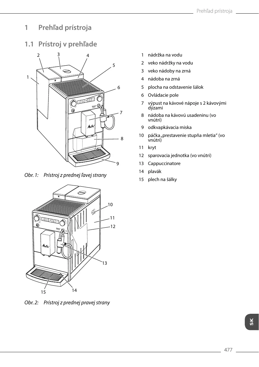 Prehľad prístroja 477 1.1 Prístroj v prehľade 477 1.2 Ovládacie pole v prehľade 478 1.3 Cappuccinatore v prehľade 479