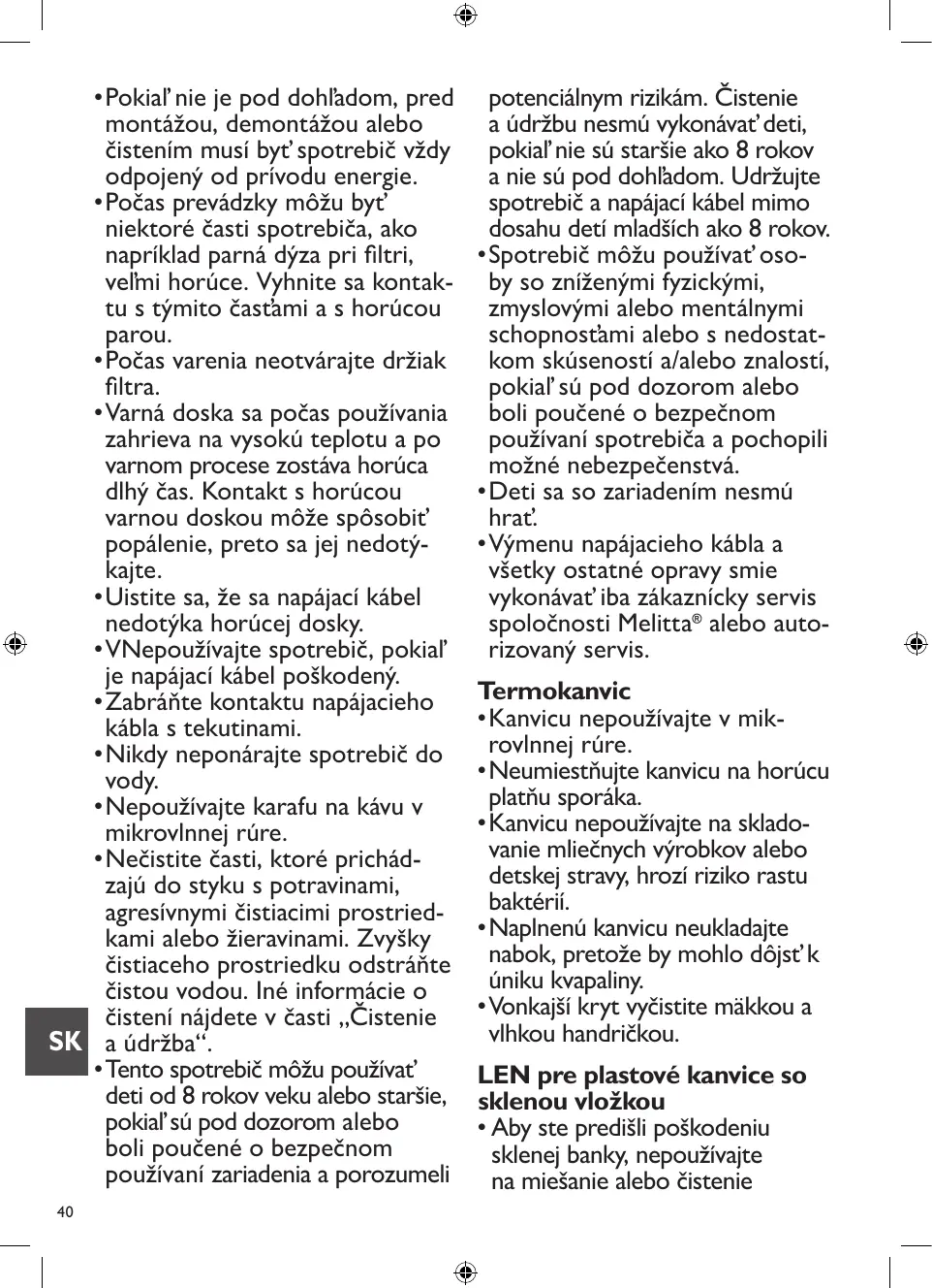 • Cet appareil peut être utilisé par des personnes présentant des aptitudes physiques, sensorielles ou mentales limitées ou FR un manque d'expérience et/ou de connaissances si elles sont surveillées ou si elles ont été instruites quant à l'utilisation de l'appareil et aux dangers associés et si elles ont compris les dangers potentiels. • Les enfants ne doivent pas jouer avec l'appareil. • Le remplacement du cordon d'alimentation et toute autre réparation doivent uniquement être effectués par le service après-vente de Melitta® ou par un réparateur agrée. Verseuse isotherme • Ne pas mettre la verseuse au micro-ondes. • Ne pas placer la verseuse sur une cuisinière chaude. • Ne pas utiliser la verseuse pour stocker des produits laitiers ou de la nourriture pour bébés car il existe un risque de prolifération des bactéries. • Ne pas coucher la verseuse remplie sur le côté car du liquide pourrait fuir.