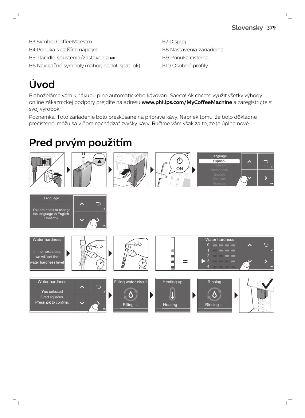 Úvod Blahoželáme vám k nákupu plne automatického kávovaru Saeco! Ak chcete využiť všetky výhody online zákazníckej podpory prejdite na adresu www.philips.com/MyCoffeeMachine a zaregistrujte si svoj výrobok. Poznámka: Toto zariadenie bolo preskúšané na príprave kávy. Napriek tomu, že bolo dôkladne prečistené, môžu sa v ňom nachádzať zvyšky kávy. Ručíme vám však za to, že je úplne nové.