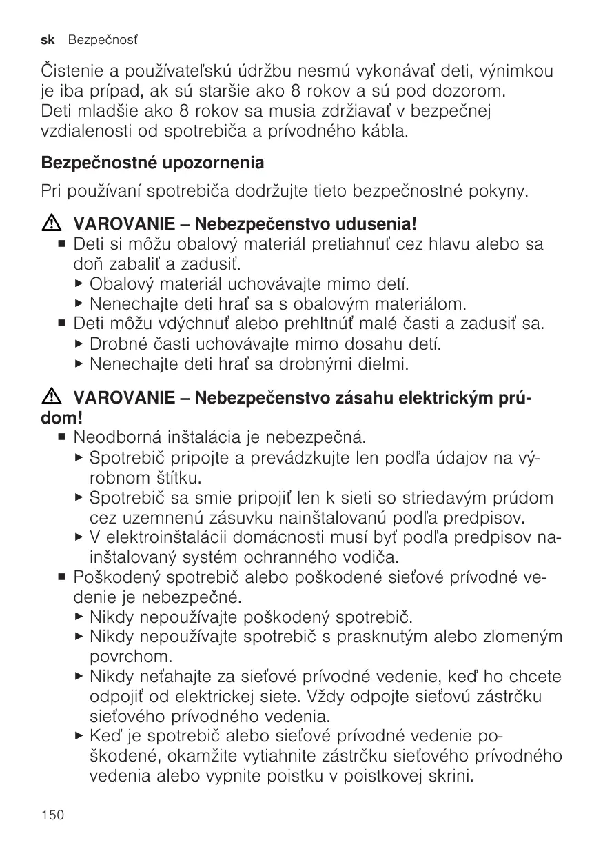 Čistenie a používateľskú údržbu nesmú vykonávať deti, výnimkou je iba prípad, ak sú staršie ako 8 rokov a sú pod dozorom. Deti mladšie ako 8 rokov sa musia zdržiavať v bezpečnej vzdialenosti od spotrebiča a prívodného kábla. Bezpečnostné upozornenia Pri používaní spotrebiča dodržujte tieto bezpečnostné pokyny. VAROVANIE ‒ Nebezpečenstvo udusenia! ¡ Deti si môžu obalový materiál pretiahnuť cez hlavu alebo sa doň zabaliť a zadusiť. ▶ Obalový materiál uchovávajte mimo detí. ▶ Nenechajte deti hrať sa s obalovým materiálom. ¡ Deti môžu vdýchnuť alebo prehltnúť malé časti a zadusiť sa. ▶ Drobné časti uchovávajte mimo dosahu detí. ▶ Nenechajte deti hrať sa drobnými dielmi. VAROVANIE ‒ Nebezpečenstvo zásahu elektrickým prúdom! ¡ Neodborná inštalácia je nebezpečná. ▶ Spotrebič pripojte a prevádzkujte len podľa údajov na výrobnom štítku. ▶ Spotrebič sa smie pripojiť len k sieti so striedavým prúdom cez uzemnenú zásuvku nainštalovanú podľa predpisov. ▶ V elektroinštalácii domácnosti musí byť podľa predpisov nainštalovaný systém ochranného vodiča. ¡ Poškodený spotrebič alebo poškodené sieťové prívodné vedenie je nebezpečné. ▶ Nikdy nepoužívajte poškodený spotrebič. ▶ Nikdy nepoužívajte spotrebič s prasknutým alebo zlomeným povrchom. ▶ Nikdy neťahajte za sieťové prívodné vedenie, keď ho chcete odpojiť od elektrickej siete. Vždy odpojte sieťovú zástrčku sieťového prívodného vedenia. ▶ Keď je spotrebič alebo sieťové prívodné vedenie poškodené, okamžite vytiahnite zástrčku sieťového prívodného vedenia alebo vypnite poistku v poistkovej skrini. 150