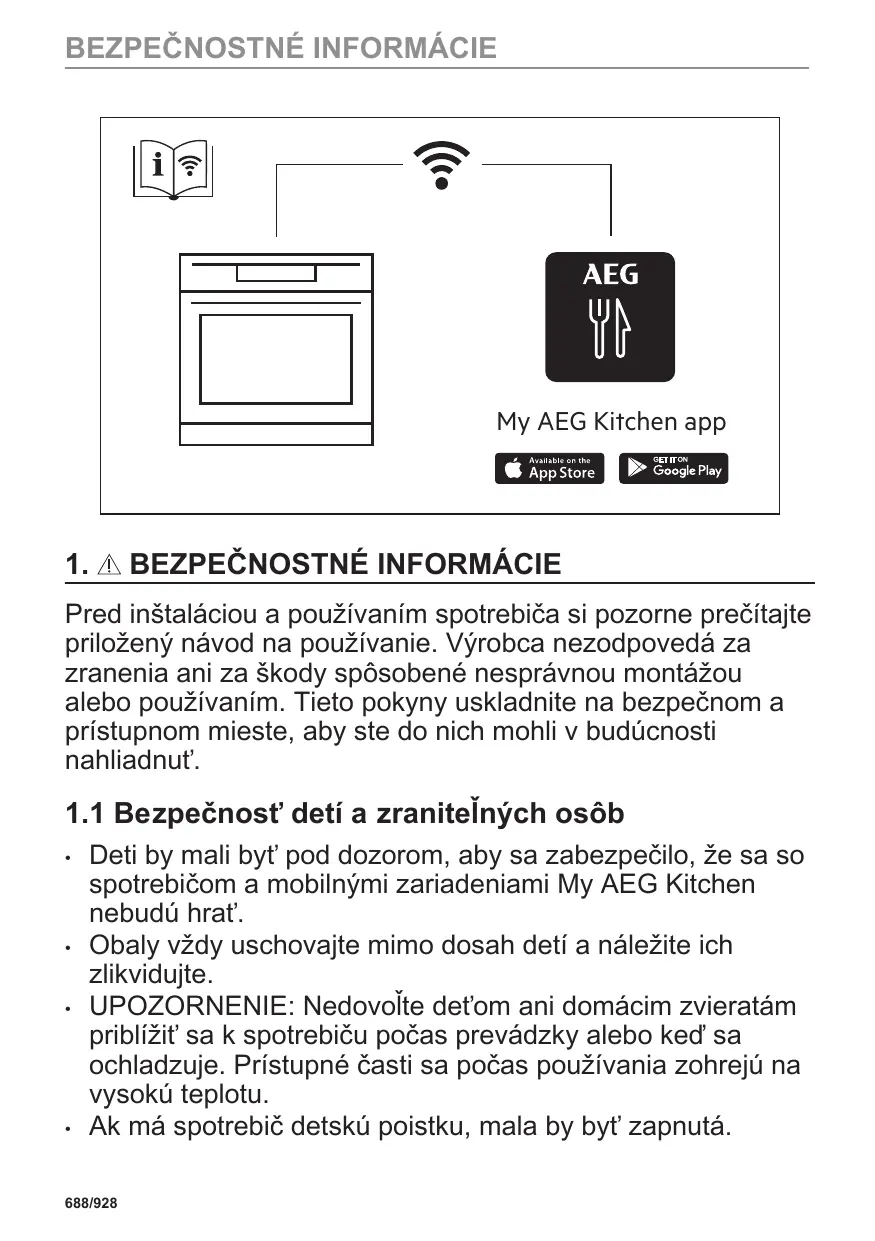 Deti by mali byť pod dozorom, aby sa zabezpečilo, že sa so spotrebičom a mobilnými zariadeniami My AEG Kitchen nebudú hrať. Obaly vždy uschovajte mimo dosah detí a náležite ich zlikvidujte. UPOZORNENIE: Nedovoľte deťom ani domácim zvieratám priblížiť sa k spotrebiču počas prevádzky alebo keď sa ochladzuje. Prístupné časti sa počas používania zohrejú na vysokú teplotu. Ak má spotrebič detskú poistku, mala by byť zapnutá. 688/928