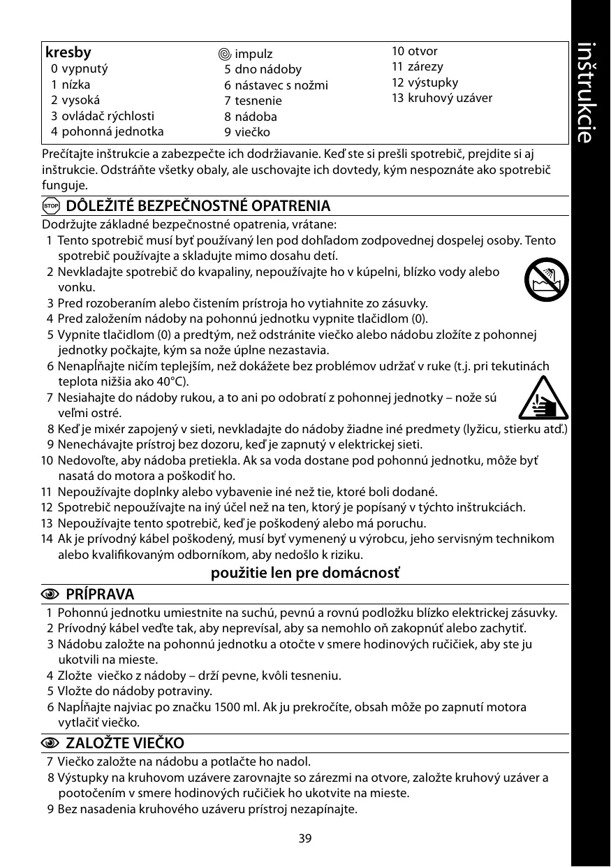 A DÔLEŽITÉ BEZPEČNOSTNÉ OPATRENIA Dodržujte základné bezpečnostné opatrenia, vrátane: 1 Tento spotrebič musí byť používaný len pod dohľadom zodpovednej dospelej osoby. Tento spotrebič používajte a skladujte mimo dosahu detí. 2 Nevkladajte spotrebič do kvapaliny, nepoužívajte ho v kúpelni, blízko vody alebo vonku. 3 Pred rozoberaním alebo čistením prístroja ho vytiahnite zo zásuvky. 4 Pred založením nádoby na pohonnú jednotku vypnite tlačidlom (0). 5 Vypnite tlačidlom (0) a predtým, než odstránite viečko alebo nádobu zložíte z pohonnej jednotky počkajte, kým sa nože úplne nezastavia. 6 Nenapĺňajte ničím teplejším, než dokážete bez problémov udržať v ruke (t.j. pri tekutinách teplota nižšia ako 40°C). 7 Nesiahajte do nádoby rukou, a to ani po odobratí z pohonnej jednotky – nože sú veľmi ostré. 8 Keď je mixér zapojený v sieti, nevkladajte do nádoby žiadne iné predmety (lyžicu, stierku atď.) 9 Nenechávajte prístroj bez dozoru, keď je zapnutý v elektrickej sieti. 10 Nedovoľte, aby nádoba pretiekla. Ak sa voda dostane pod pohonnú jednotku, môže byť nasatá do motora a poškodiť ho. 11 Nepoužívajte doplnky alebo vybavenie iné než tie, ktoré boli dodané. 12 Spotrebič nepoužívajte na iný účel než na ten, ktorý je popísaný v týchto inštrukciách. 13 Nepoužívajte tento spotrebič, keď je poškodený alebo má poruchu. 14 Ak je prívodný kábel poškodený, musí byť vymenený u výrobcu, jeho servisným technikom alebo kvalifikovaným odborníkom, aby nedošlo k riziku.