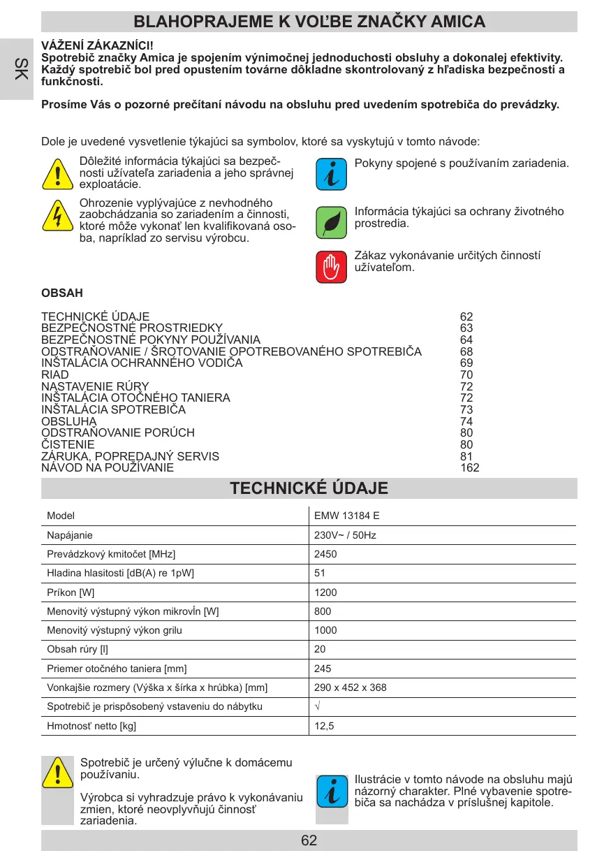 VÁŽENÍ ZÁKAZNÍCI! Spotrebič značky Amica je spojením výnimočnej jednoduchosti obsluhy a dokonalej efektivity. Každý spotrebič bol pred opustením továrne dôkladne skontrolovaný z hľadiska bezpečnosti a funkčnosti. Prosíme Vás o pozorné prečítaní návodu na obsluhu pred uvedením spotrebiča do prevádzky. Dole je uvedené vysvetlenie týkajúci sa symbolov, ktoré sa vyskytujú v tomto návode: Dôležité informácia týkajúci sa bezpečnosti užívateľa zariadenia a jeho správnej exploatácie.