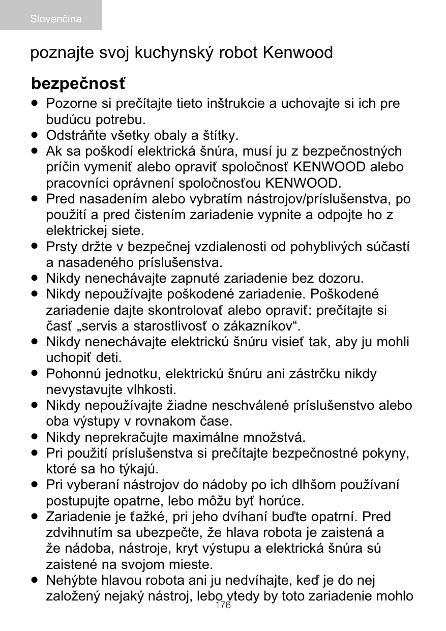 Pozorne si prečítajte tieto inštrukcie a uchovajte si ich pre budúcu potrebu. Odstráňte všetky obaly a štítky. Ak sa poškodí elektrická šnúra, musí ju z bezpečnostných príčin vymeniť alebo opraviť spoločnosť KENWOOD alebo pracovníci oprávnení spoločnosťou KENWOOD. Pred nasadením alebo vybratím nástrojov/príslušenstva, po použití a pred čistením zariadenie vypnite a odpojte ho z elektrickej siete. Prsty držte v bezpečnej vzdialenosti od pohyblivých súčastí a nasadeného príslušenstva. Nikdy nenechávajte zapnuté zariadenie bez dozoru. Nikdy nepoužívajte poškodené zariadenie. Poškodené zariadenie dajte skontrolovať alebo opraviť: prečítajte si časť „servis a starostlivosť o zákazníkov“. Nikdy nenechávajte elektrickú šnúru visieť tak, aby ju mohli uchopiť deti. Pohonnú jednotku, elektrickú šnúru ani zástrčku nikdy nevystavujte vlhkosti. Nikdy nepoužívajte žiadne neschválené príslušenstvo alebo oba výstupy v rovnakom čase. Nikdy neprekračujte maximálne množstvá. Pri použití príslušenstva si prečítajte bezpečnostné pokyny, ktoré sa ho týkajú. Pri vyberaní nástrojov do nádoby po ich dlhšom používaní postupujte opatrne, lebo môžu byť horúce. Zariadenie je ťažké, pri jeho dvíhaní buďte opatrní. Pred zdvihnutím sa ubezpečte, že hlava robota je zaistená a že nádoba, nástroje, kryt výstupu a elektrická šnúra sú zaistené na svojom mieste. Nehýbte hlavou robota ani ju nedvíhajte, keď je do nej založený nejaký nástroj, lebo vtedy by toto zariadenie mohlo 176