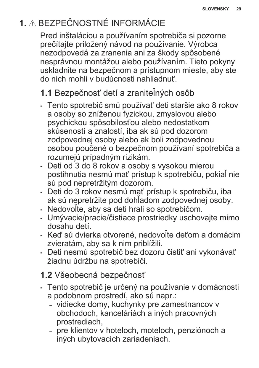 Tento spotrebič smú používať deti staršie ako 8 rokov a osoby so zníženou fyzickou, zmyslovou alebo psychickou spôsobilosťou alebo nedostatkom skúseností a znalostí, iba ak sú pod dozorom zodpovednej osoby alebo ak boli zodpovednou osobou poučené o bezpečnom používaní spotrebiča a rozumejú prípadným rizikám. Deti od 3 do 8 rokov a osoby s vysokou mierou postihnutia nesmú mať prístup k spotrebiču, pokiaľ nie sú pod nepretržitým dozorom. Deti do 3 rokov nesmú mať prístup k spotrebiču, iba ak sú nepretržite pod dohľadom zodpovednej osoby. Nedovoľte, aby sa deti hrali so spotrebičom. Umývacie/pracie/čistiace prostriedky uschovajte mimo dosahu detí. Keď sú dvierka otvorené, nedovoľte deťom a domácim zvieratám, aby sa k nim priblížili. Deti nesmú spotrebič bez dozoru čistiť ani vykonávať žiadnu údržbu na spotrebiči.