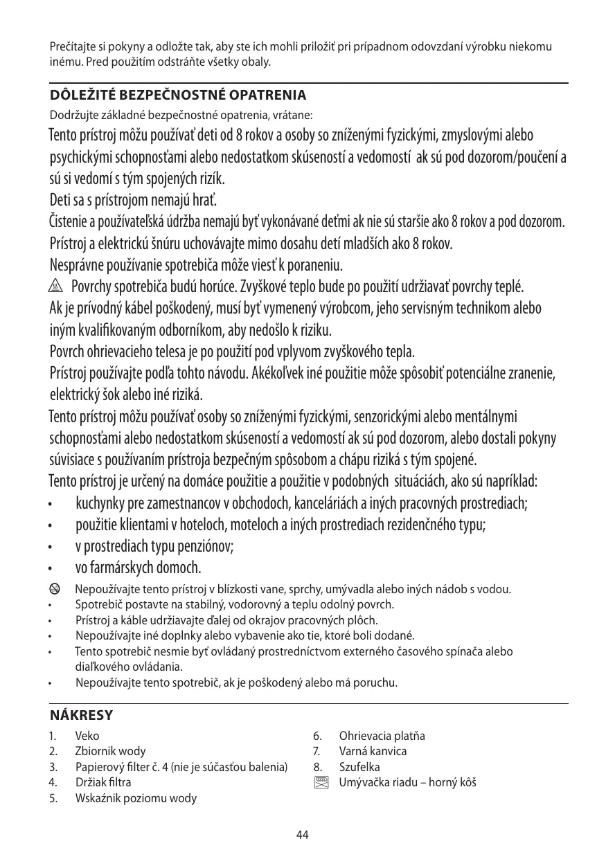 Tento prístroj môžu používať deti od 8 rokov a osoby so zníženými fyzickými, zmyslovými alebo psychickými schopnosťami alebo nedostatkom skúseností a vedomostí ak sú pod dozorom/poučení a sú si vedomí s tým spojených rizík. Deti sa s prístrojom nemajú hrať. Čistenie a používateľská údržba nemajú byť vykonávané deťmi ak nie sú staršie ako 8 rokov a pod dozorom. Prístroj a elektrickú šnúru uchovávajte mimo dosahu detí mladších ako 8 rokov. Nesprávne používanie spotrebiča môže viesť k poraneniu. h Povrchy spotrebiča budú horúce. Zvyškové teplo bude po použití udržiavať povrchy teplé. Ak je prívodný kábel poškodený, musí byť vymenený výrobcom, jeho servisným technikom alebo iným kvalifikovaným odborníkom, aby nedošlo k riziku. Povrch ohrievacieho telesa je po použití pod vplyvom zvyškového tepla. Prístroj používajte podľa tohto návodu. Akékoľvek iné použitie môže spôsobiť potenciálne zranenie, elektrický šok alebo iné riziká. Tento prístroj môžu používať osoby so zníženými fyzickými, senzorickými alebo mentálnymi schopnosťami alebo nedostatkom skúseností a vedomostí ak sú pod dozorom, alebo dostali pokyny súvisiace s používaním prístroja bezpečným spôsobom a chápu riziká s tým spojené. Tento prístroj je určený na domáce použitie a použitie v podobných situáciách, ako sú napríklad: • kuchynky pre zamestnancov v obchodoch, kanceláriách a iných pracovných prostrediach; • použitie klientami v hoteloch, moteloch a iných prostrediach rezidenčného typu; • v prostrediach typu penziónov; • vo farmárskych domoch. b • • • • •