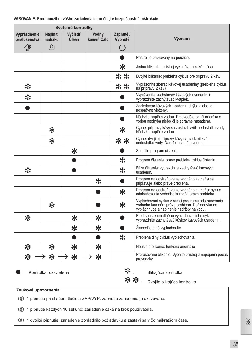 Vider le collecteur de marc (un cycle de 2 cafés est en cours). Vider le collecteur de marc + vider le bac récoltegouttes. Le collecteur de marc est absent ou mal positionné. Remplir le réservoir d'eau. Le réservoir d'eau est absent ou mal positionné. Le cycle café a été interrompu par manque d'eau. Remplir le réservoir d'eau. Le cycle double café a été interrompu par manque d'eau. Remplir le réservoir. Programme de nettoyage demandé. Programme de nettoyage : cycle de nettoyage en cours. Phase de nettoyage : vider le bac à marc. Programme de détartrage demandé. Programme de détartrage : cycle de détartrage en cours. Cycles de rinçage du programme de détartrage : en cours. Demande de vider et de remplir le réservoir d'eau. Vider le bac à cake avant le lancement d'un rinçage long. Demande rinçage long. Rinçage long en cours. Clignotement Simultané : anomalie de fonctionnement. Clignotement voyant après voyant : mise en hors tension de l'appareil en cours. :