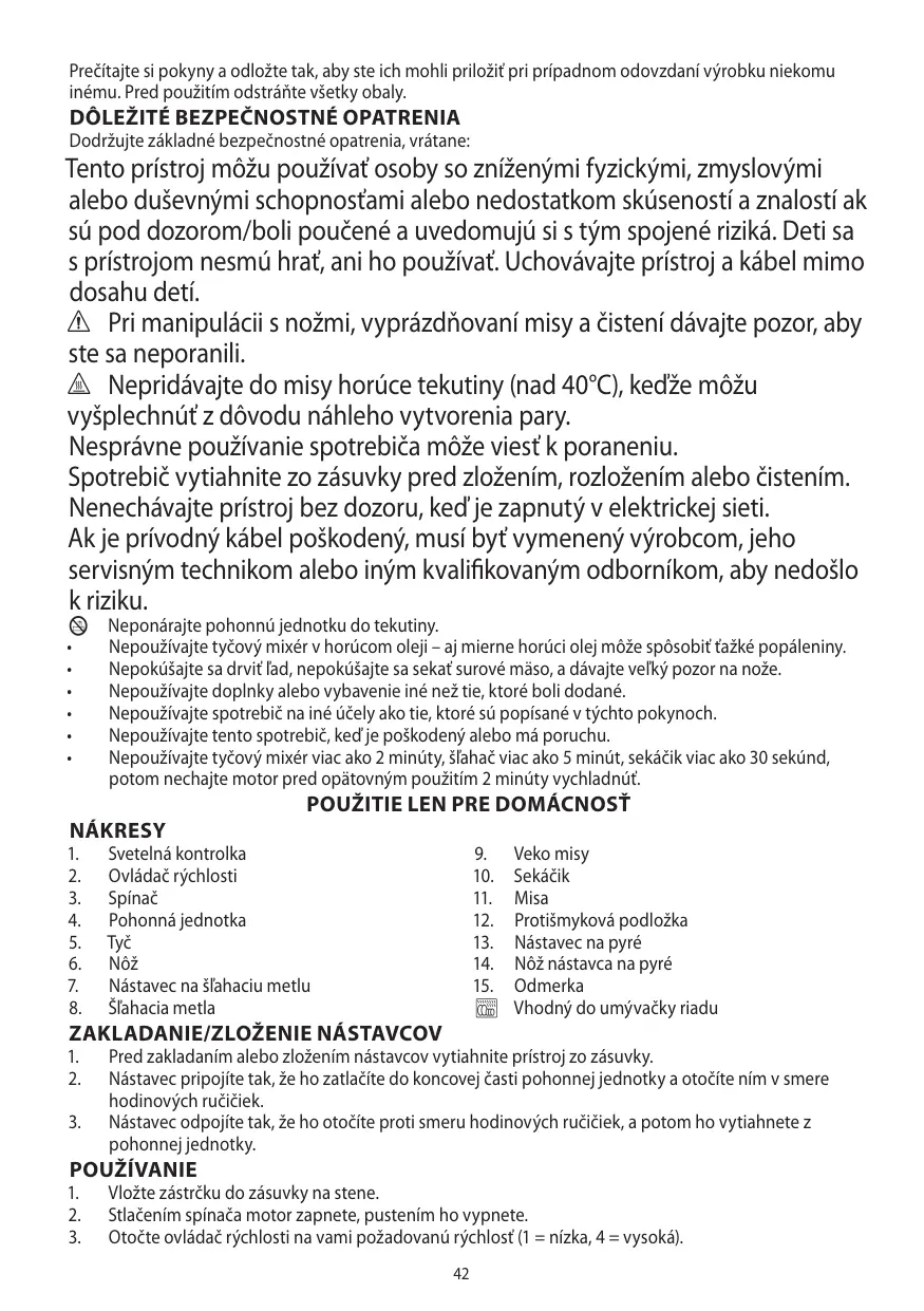 • N’essayez pas de piler de la glace ou de hacher de la viande crue et faites attention aux lames. N’adaptez pas d’accessoires autres que ceux fournis. N’utilisez pas l’appareil à d’autres fins que celles décrites dans ce mode d’emploi. N’utilisez pas l’appareil s’il est endommagé ou s’il ne fonctionne pas correctement. Ne pas utiliser le batteur pendant plus de 2 minutes, le fouet pendant plus de 5 minutes, le hachoir pendant plus de 30 secondes. Laissez le moteur refroidir pendant 2 minutes avant d’utiliser à nouveau ces accessoires.