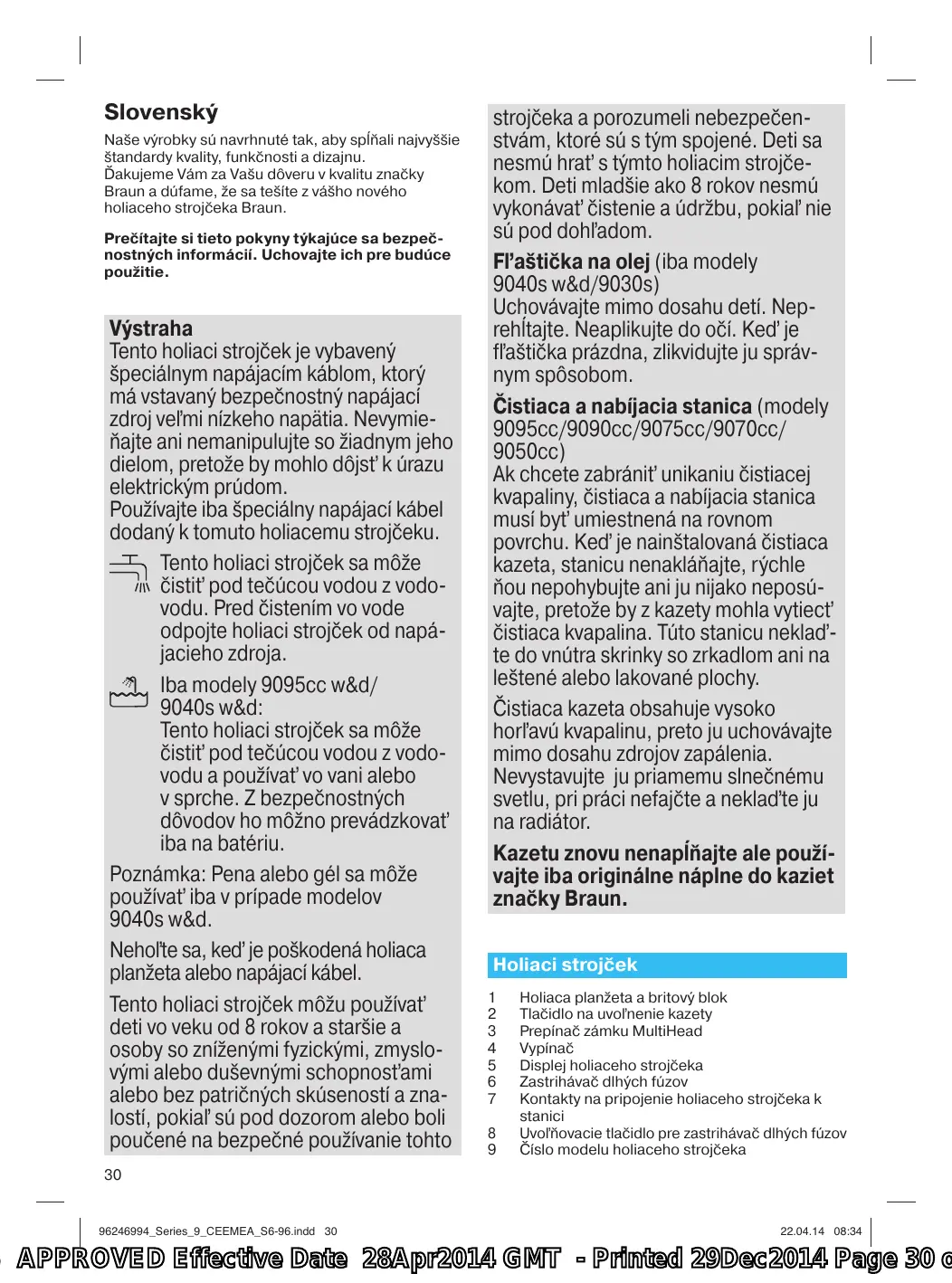 strojčeka a porozumeli nebezpečenstvám, ktoré sú s tým spojené. Deti sa nesmú hrať s týmto holiacim strojčekom. Deti mladšie ako 8 rokov nesmú vykonávať čistenie a údržbu, pokiaľ nie sú pod dohľadom. Fľaštička na olej (iba modely 9040s w&d/9030s) Uchovávajte mimo dosahu detí. Neprehĺtajte. Neaplikujte do očí. Keď je fľaštička prázdna, zlikvidujte ju správnym spôsobom. Čistiaca a nabíjacia stanica (modely 9095cc/9090cc/9075cc/9070cc/ 9050cc) Ak chcete zabrániť unikaniu čistiacej kvapaliny, čistiaca a nabíjacia stanica musí byť umiestnená na rovnom povrchu. Keď je nainštalovaná čistiaca kazeta, stanicu nenakláňajte, rýchle ňou nepohybujte ani ju nijako neposúvajte, pretože by z kazety mohla vytiecť čistiaca kvapalina. Túto stanicu neklaďte do vnútra skrinky so zrkadlom ani na leštené alebo lakované plochy. Čistiaca kazeta obsahuje vysoko horľavú kvapalinu, preto ju uchovávajte mimo dosahu zdrojov zapálenia. Nevystavujte ju priamemu slnečnému svetlu, pri práci nefajčte a neklaďte ju na radiátor. Kazetu znovu nenapĺňajte ale používajte iba originálne náplne do kaziet značky Braun. Holiaci strojček 1 2 3 4 5 6 7 8 9
