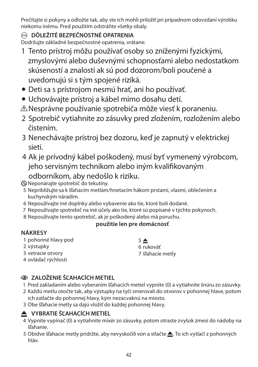 1 Tento prístroj môžu používať osoby so zníženými fyzickými, zmyslovými alebo duševnými schopnosťami alebo nedostatkom skúseností a znalostí ak sú pod dozorom/boli poučené a uvedomujú si s tým spojené riziká. • Deti sa s prístrojom nesmú hrať, ani ho používať. • Uchovávajte prístroj a kábel mimo dosahu detí. c Nesprávne používanie spotrebiča môže viesť k poraneniu. 2 Spotrebič vytiahnite zo zásuvky pred zložením, rozložením alebo čistením. 3 Nenechávajte prístroj bez dozoru, keď je zapnutý v elektrickej sieti. 4 Ak je prívodný kábel poškodený, musí byť vymenený výrobcom, jeho servisným technikom alebo iným kvalifikovaným odborníkom, aby nedošlo k riziku. L Neponárajte spotrebič do tekutiny. 5 Nepribližujte sa k šľahacím metlám/hnetacím hákom prstami, vlasmi, oblečením a kuchynským náradím. 6 Nepoužívajte iné doplnky alebo vybavenie ako tie, ktoré boli dodané. 7 Nepoužívajte spotrebič na iné účely ako tie, ktoré sú popísané v týchto pokynoch. 8 Nepoužívajte tento spotrebič, ak je poškodený alebo má poruchu.