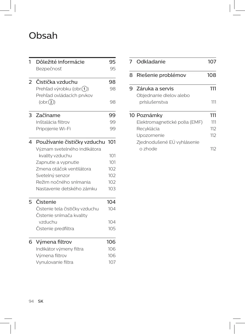 110 SK Ak je váš čistička pripojená k dvojpásmovému smerovaču a momentálne nie je aktivované pásmo 2,4 GHz, prepnite smerovač na pásmo 2,4 GHz a pokúste sa čističku spárovať znova. Siete v pásme 5 GHz nie sú podporované. Siete s webovým overením nie sú podporované. Skontrolujte, či sa čistička nachádza v dosahu smerovača Wi-Fi. Skúste čističku vzduchu umiestniť bližšie k smerovaču Wi-Fi. Skontrolujte, či používate správny názov siete. Názov siete rozlišuje veľké a malé písmená. Skontrolujte, či používate správne heslo siete Wi-Fi. Heslo rozlišuje malé a veľké písmená. Skúste nastavenie znova podľa pokynov uvedených v časti „Nastavenie pripojenia Wi-Fi po zmene siete“. Môže dôjsť k prerušeniu pripojenia Wi-Fi pôsobením elektromagnetického alebo iného druhu rušenia. Čističku udržujte mimo dosahu iných elektronických zariadení, ktoré by mohli spôsobovať rušenie. Skontrolujte, či nie je mobilné zariadenie v režime v lietadle. Pri pripájaní k sieti Wi-Fi sa uistite, že je režim v lietadle vypnutý. Rozsiahle a aktuálne tipy na riešenie problémov nájdete v pomocníkovi aplikácie. Ak potrebujete informácie alebo máte nejaký problém, navštívte webovú lokalitu spoločnosti Philips na adrese www.philips.com alebo sa obráťte na Stredisko starostlivosti o zákazníkov spoločnosti Philips vo svojej krajine (telefónne číslo strediska nájdete v medzinárodnom záručnom liste). Ak sa vo vašej krajine toto stredisko nenachádza, obráťte sa na miestneho predajcu výrobkov Philips. Objednanie dielov alebo príslušenstva Ak potrebujete vymeniť nejaký diel alebo si chcete zakúpiť ďalší diel, navštívte predajcu značky Philips alebo stránku www.philips.com/support. Ak máte problém diely zohnať, obráťte sa na stredisko starostlivosti o zákazníkov spoločnosti Philips vo svojej krajine (telefónne číslo do tohto strediska nájdete v medzinárodnom záručnom liste). 10 Poznámky Elektromagnetické polia (EMF) Tento spotrebič značky Philips vyhovuje všetkým príslušným normám a smerniciam týkajúcim sa vystavenia elektromagnetickým poliam. Súlad s normami týkajúcimi sa elektromagnetických polí Koninklijke Philips N.V. vyrába a predáva mnoho produktov určených pre zákazníkov, ktoré ako akékoľvek elektronické zariadenia majú vo všeobecnosti schopnosť vyžarovať a prijímať elektromagnetické signály. Jedným z hlavných obchodných princípov spoločnosti Philips je vykonať všetky potrebné opatrenia na ochranu zdravia a bezpečnosti pri používaní našich produktov s cieľom dodržať všetky príslušné zákonné požiadavky a v dostatočnej miere ich zosúladiť s normami EMF platnými v čase výroby produktov. Spoločnosť Philips je odhodlaná vyvíjať, vyrábať a predávať produkty, ktoré nemajú žiadne nepriaznivé účinky na zdravie. Spoločnosť Philips potvrdzuje, že ak sa s jej produktmi správne zaobchádza a používajú sa na zamýšľaný účel, ich použitie je podľa dnes dostupných vedeckých poznatkov bezpečné. Spoločnosť Philips hrá aktívnu úlohu vo vývoji medzinárodných bezpečnostných a EMF štandardov, čo spoločnosti Philips umožňuje predpokladať budúci vývoj v štandardizácii a zavčasu ho integrovať do svojich produktov.